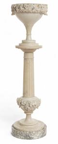 Pair of Italian Carved Alabaster Amphora Atop Matching Pedestal Bases, 20th C., H 43” Dia. 15”