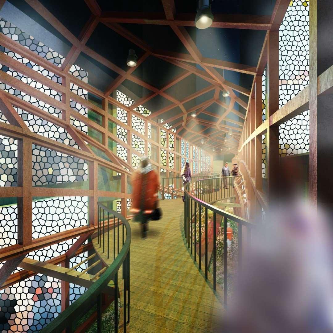 ThedesignoftheoverallbuildingwasinspireduthelegendsoftheGreatBeninWall (earthwallsurroundedbyamoat,saidtobelongerthantheGreatWallofChina)andthe WestAfricantraditionofenteringabuildingfromitsamenableroof.Thesetwoconcepts bringasenseofsecurityandportentousnesstotheproject.