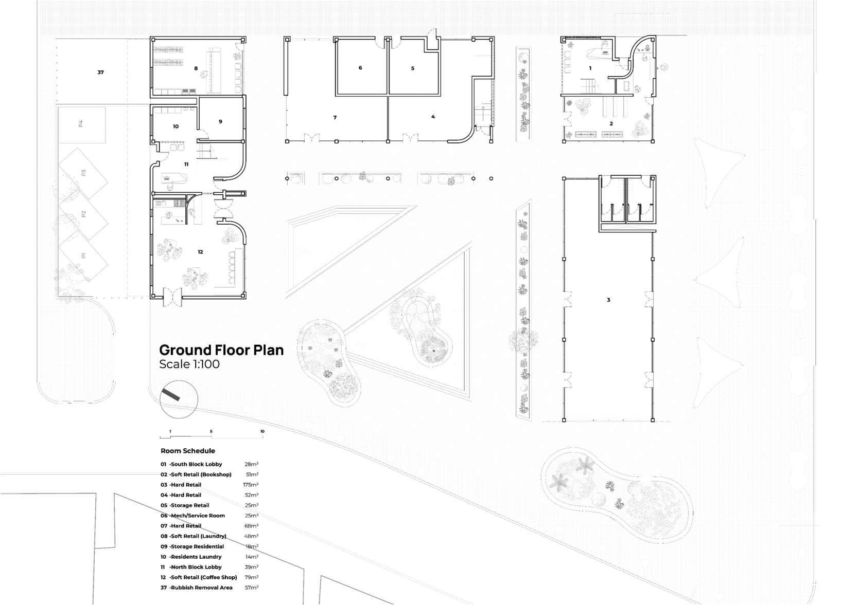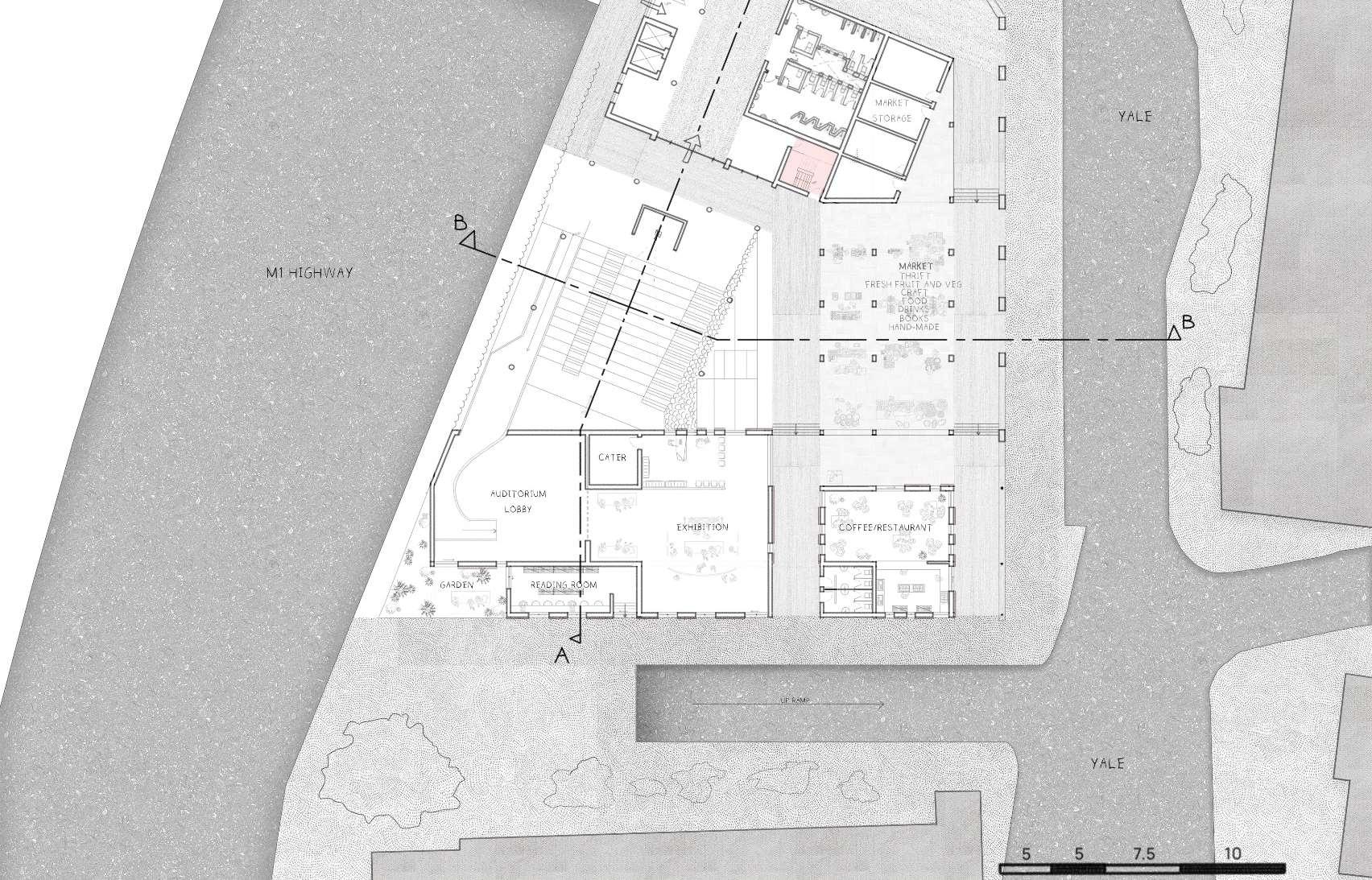 p.10 GroundFloorPlan Scale1:200@A2 1AmicDeck 2Auditorium 3PedestrianBridge 3 1 2