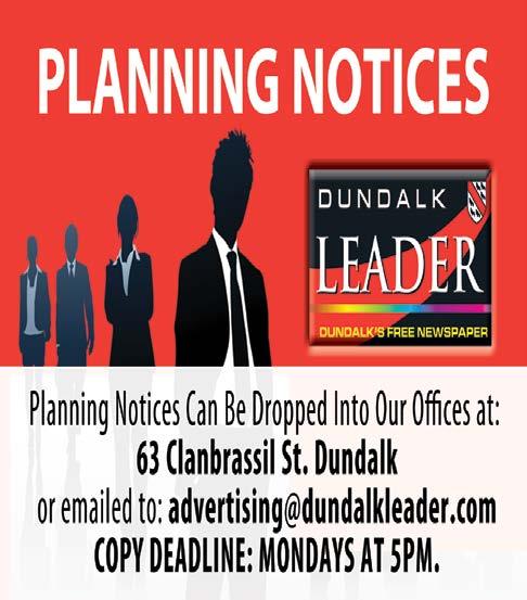 LOUTH COUNTY COUNCIL—I, Ruth Hughes, intend to apply for Full Planning Permission for a dwelling house and associated works at Racecourse Road, Dundalk, Co. Louth. This planning application may be inspected or purchased at a fee not exceeding the reasonable cost of making a copy, at the offices of Louth County Council from 9.30am to 4.30pm Monday to Friday. A submission or observation in relation to the application may be made to the Authority in writing within a period of 5 weeks from the date of receipt by the Authority of the application and on payment of the prescribed fee of €20.00.