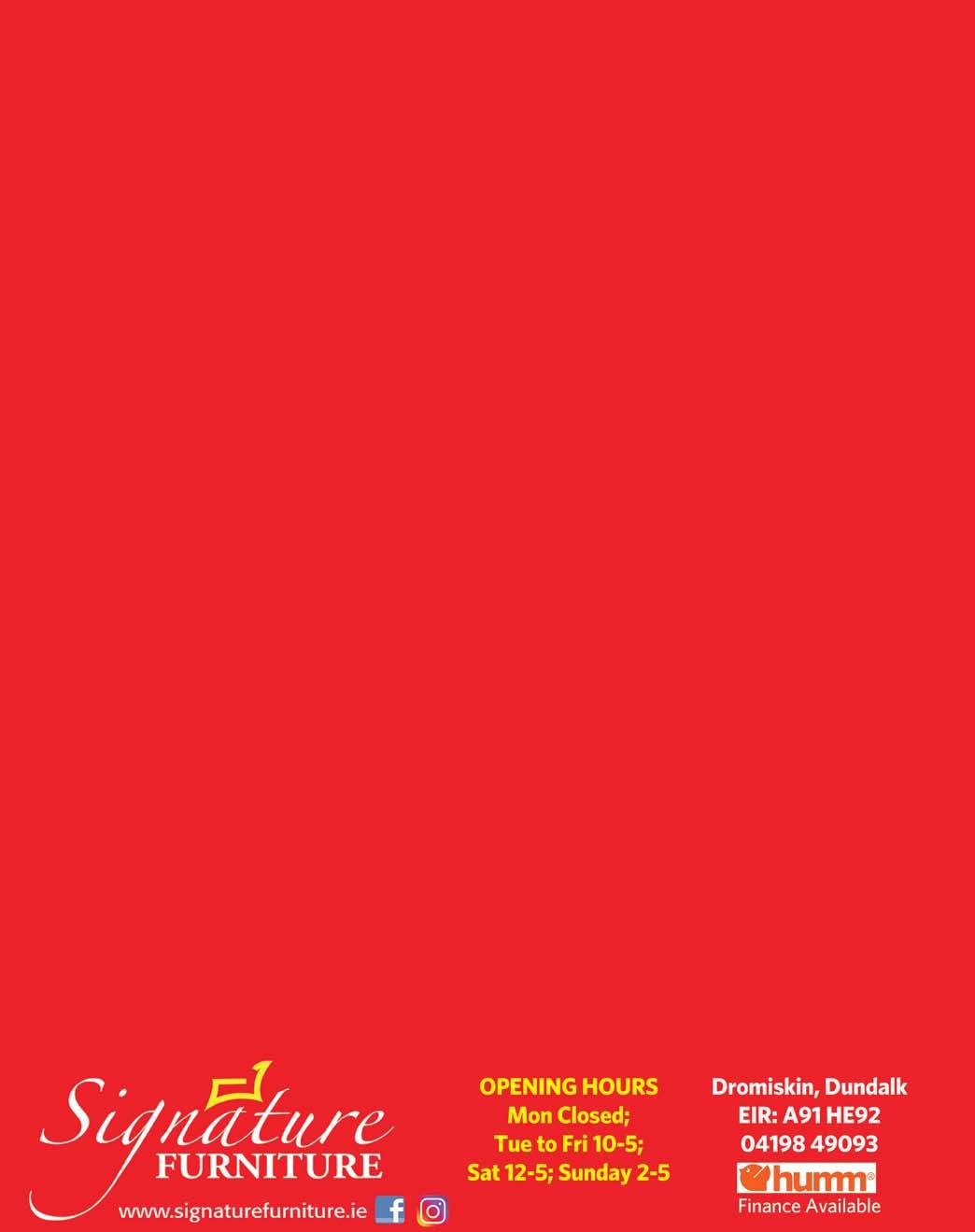 Dundalk Leader 4th January 2023 7 OpEn 7 DAYS MOn to SAT 9.30 - 5.30pm & SunDAY 2-5pm LARGE S ELECTIO n O f . . . Rugs, Lamps, Mirrors, pictures & Occasional furniture Coe's Road, d undalk (beside l allys) Ph: 042 938 6371 D E p OSIT S EC u RES A N y ITEM - f REE DELIVER y 4’ 6” Divan & Mattress starting from €299, Singles from €199 Sliding Robe S From €599 large Range of bedroom Furniture in Stock irish made Queen Anne Chairs, your choice of over 100 Fabrics in Patchwork, Plain, Strips, etc Corner Group footstool included Corner Suite choice of over 100 colours and combinations 3-1-1 choice of over 50 colours and combinations 2.5 -1-1 All electric Recliner Suite includes built-in console and wireless charger. oveR 60 suites on disPlay Pat McKenna t/a january sale now on A Range of o ver 30 beds, Storage beds & Mattresses on display at Unbeatable Prices oveR 20 dining sets on disPlay
