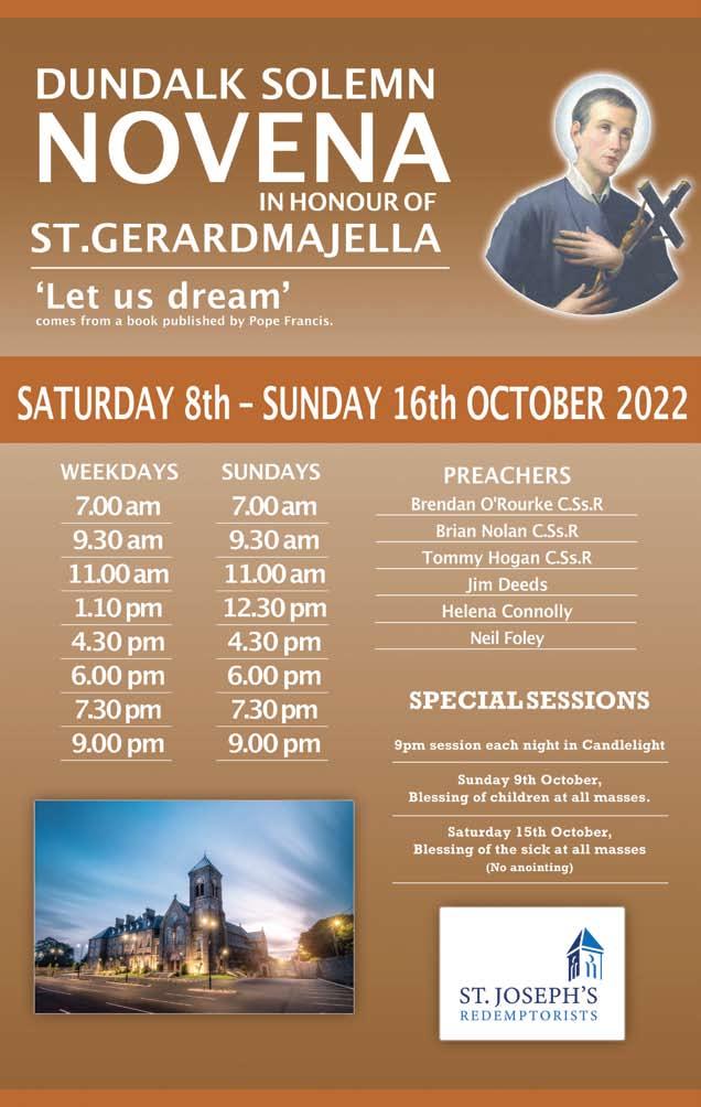 THe annual Redemptorist no vena to St Gerard Majella will take place in St. Joseph’s Mon astery between the 8th and 16th october 2022. The theme of this year’s novena is ‘Let us Dream,’ based on the book published by Pope Francis.