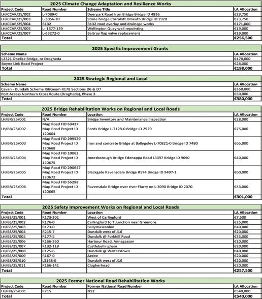 The 2025 grants programme demonstrates a significant increase in investment across various grant categories, with boosted funding for Restoration Improvement, bridge rehabilitation, safety projects and the Community Involvement Scheme. The Department of Transport will also continue to offer grant assistance to Local Authorities for the implementation of reduced speed limits on rural local roads.