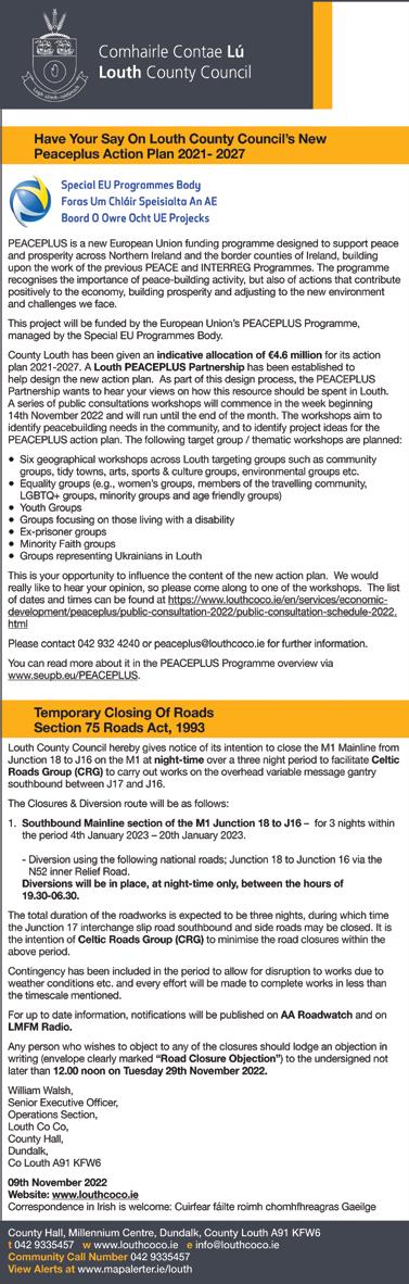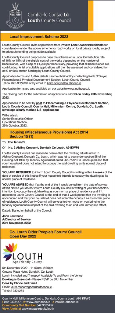for signing at County Hall Dundalk, Ardee Library & The Tholsel Droghe da for one week from the 18th No vember 2022.