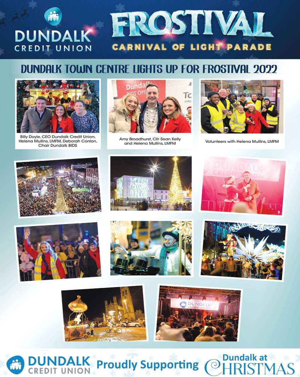 Dundalk BIDS or ganised Frostival in partnership with Dun dalk Credit Union. They were supported by Louth County Coun cil. The highlight of the festival, the Carnival of Light Parade, sig nalled the beginning of