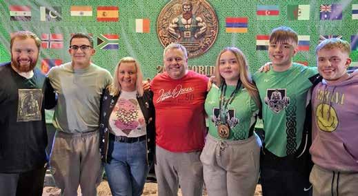 Lucy’s brother Scott also had an amazing day taking home gold in another big flight of eight boys in the under 16 section. Fourteenyear old Scott took part in the 67.5 kg category and he squatted 155 kgs, benched 82.5 kgs and deadlifted a monster 160 kgs. He lead from start to finish and was again coached by big brother Jay who called his numbers perfectly for win.