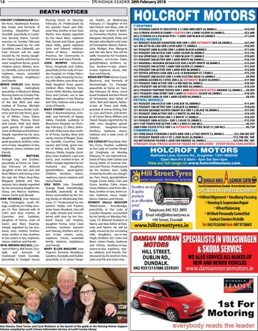 Nursing Home on Saturday February 24. Predeceased by her parents Owen and Ellie, sister Rita, brother in-law SeĂĄn Martin. Very deeply regretted by her niece Mary, nephews Neil, Gerard and Owen, grand niece Holly, grand nephews SeĂĄn and Edward, relatives. Sisters of Mercy - Northern Province, her Community in Mill Street and many friends. John Murphy Glenmore Drive, Drogheda and Collon, peacefully at Our Lady of Lourdes Hospital on Friday February 23. Sadly missed by his loving wife Aileen, sons Brian and Niall, daughter Emer, grandchildren Ellen, Harriett, Tom, Conor, Edith, Martha, Darragh, Alice and Cormac, son in law Alan, daughters in law Sheena and Orla, relatives and a large circle of friends. Mary Cooney (nĂ©e Quinn), 9 Villas 3, Muirhevenamor., Dundalk, and formerly of Happy Valley, Dundalk, suddenly in Beaumont Hospital on Thursday February 23. Mary, beloved wife of Bernard, dear mother of Fiona, Sandra, Brian and Jamie, nannie of Megan, Shauna, Danielle, Courtney, Sean, Lauren and Emily, great nannie of Abbey and Ella, sister Monica, Sheila, Angela, Geraldine, Sean, Kathleen, Liam and Gerry, and mother-in-law of Willie. Deeply regretted by her husband, son, daughters, grandchildren, great-grandchildren, brothers, sisters, nephews, nieces, relatives and many friends. Una Ross (nĂ©e Dowdall), Grange Road, Knockbridge, Dundalk, peacefully at her home surrounded by her loving family on Wednesday February 21. Predeceased by her parents Paddy and Pauline, sister Gwen Murdock, Una will be sadly missed and remembered with love by her husband David, son Andrew, daughter Emma, sister Clare Crichton, brothers Eamonn and Padraig, brothers and sisters in-law, uncles, aunts, nephews, nieces, extended family, relatives, neighbours and friends. Mary Ellen Maguire (nĂ©e Traynor) formerly Woodbury Gardens, Dundalk, and Dublin, peacefully, in St Jamesâ Hospi-