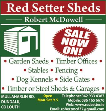 Dundalk Leader 29th March 2023 16 oPen 6 DAYS Mon to SAt 9.30 - 5.30pm LA r G e Se L e C t I on o F . . . rugs, Lamps, Mirrors, Pictures & occasional Furniture Co E ' S r o AD, D UNDALK (beside Lallys) Ph: 042 938 6371 D EPOSIT S ECURES A NY ITEM - FREE DELIVERY 4’ 6” Divan & Mattress starting from €299, Singles from €199 S LIDING R OBES From €599 Large Range of Bedroom Furniture in Stock Kayla Chairs Choice of 7 Colours Marble effect table & 6 Chairs (Available in Blue or Grey) Corner Suite choice of over 100 colours and combinations 3-2 Italian Leather Recliner – Available in All Combinations 3-1-1 All Electric Reclining Fabric Suite with Wireless Charging Port – Available in All Combinations Pat McKenna t/a EAStEr ExtrAvAGANzA A Range of Over 30 Beds, Storage Beds & Mattresses on Display at Unbeatable Prices oVEr 20 DiNiNg SETS oN DiSPLAy oVEr 60 SUiTES oN DiSPLAy