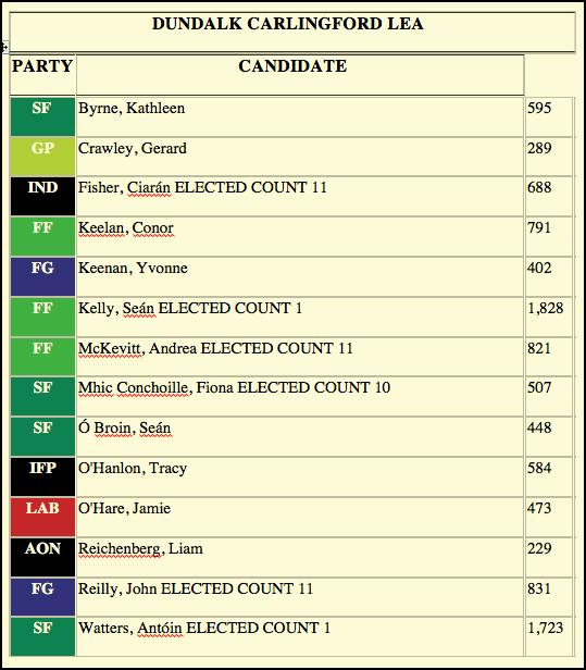 Cllr. Sean Kelly topped the poll in the Dundalk Carlingford LEA. votes. Fisher, a teacher in Coláiste Chú Chulainn, was elected after the 11th count much to the jubilation of his supporters in the count centre in Louth County Hall.