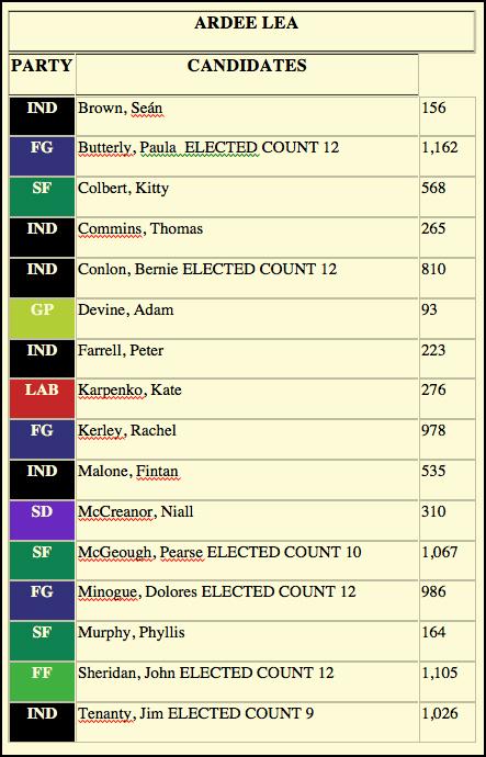 The six elected candidates in Ardee remain the same with two from Fine Gael, two independents and one each from Fianna Fail and Sinn Fein.
