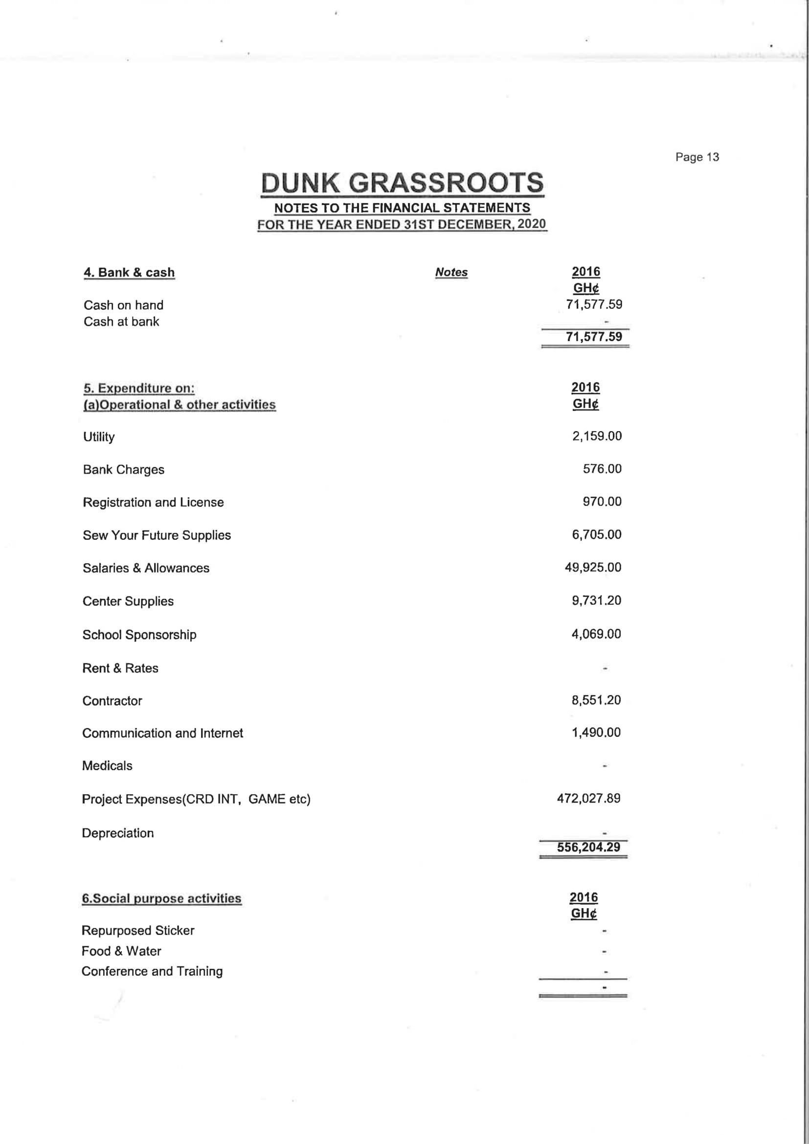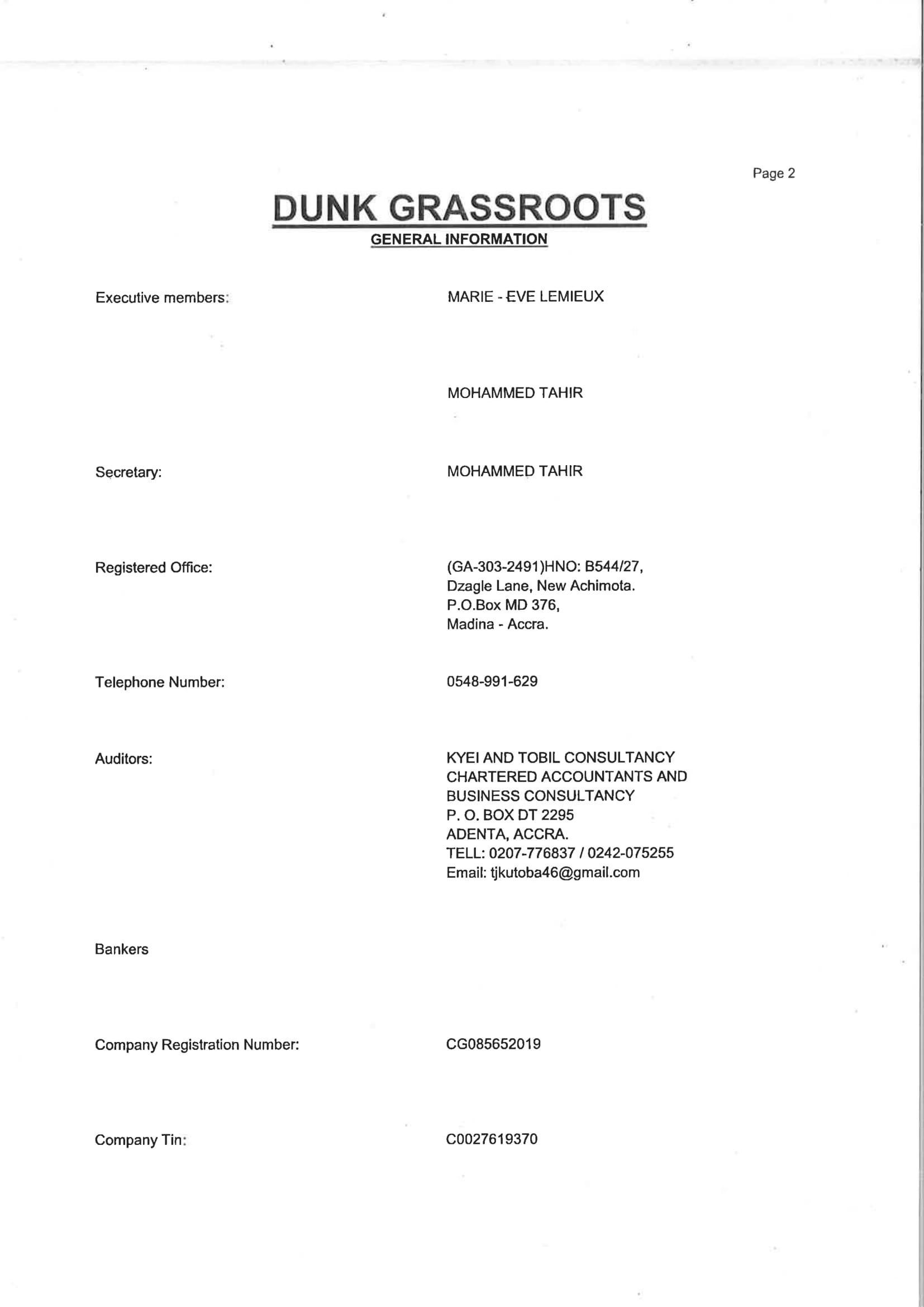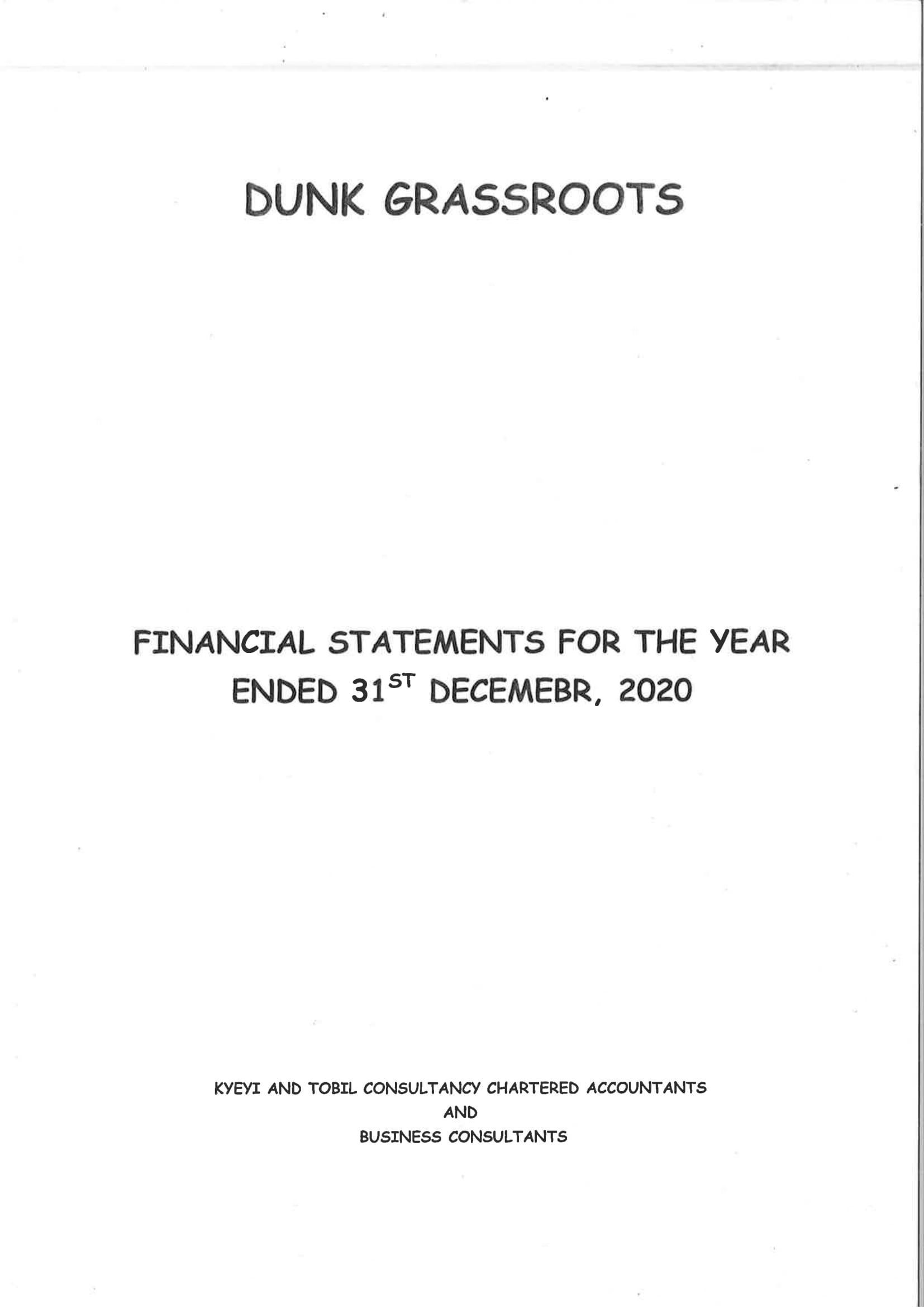 "It gives me great pleasure to present the Annual Report for DUNKGRASSROOTS for the year ending 30 December 2020. It was a challenging but also rewarding opportunities year for our organization. Despite the challenges of Coronavirus, the year finished with total revenue of 556,204.29Ghc and a rollover of 71,577.62Ghc. The impact of Coronavirus was significant, with our centres shut for ten weeks and all valid projects halted, including the funding stream. During this time, we continued to provide services to the community with relief materials. Once the centres reopened, we continued to provide a safe and inclusive venue for the community and we also adapted to digital learning for students. Thank you to all members during this time. We are continuing to assess all possibilities and will keep the members informed as these opportunities are realised"