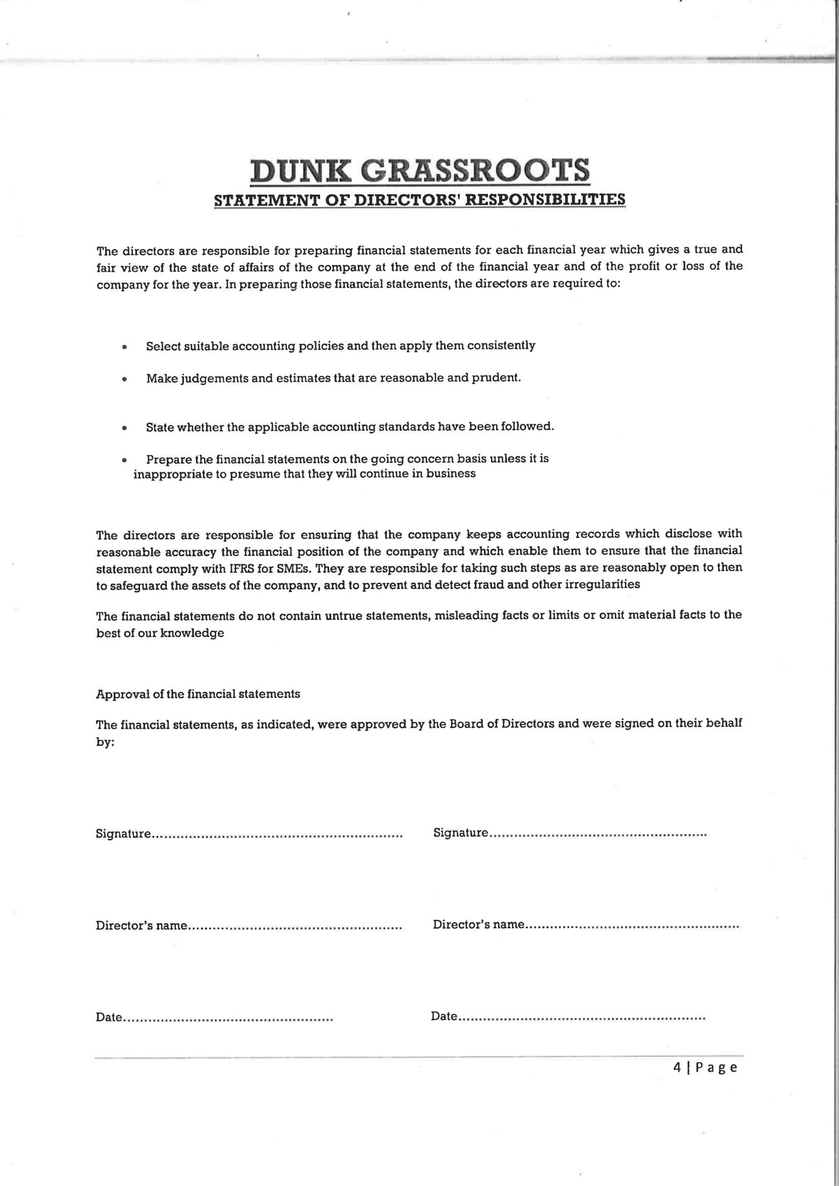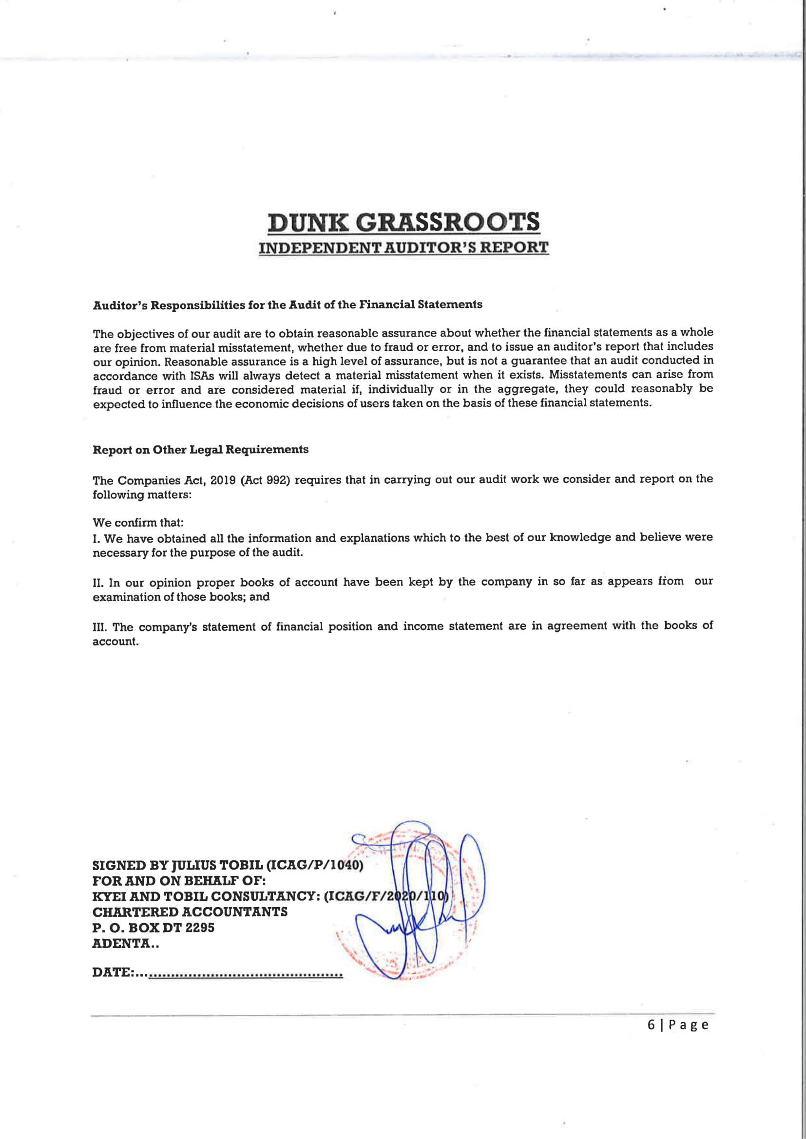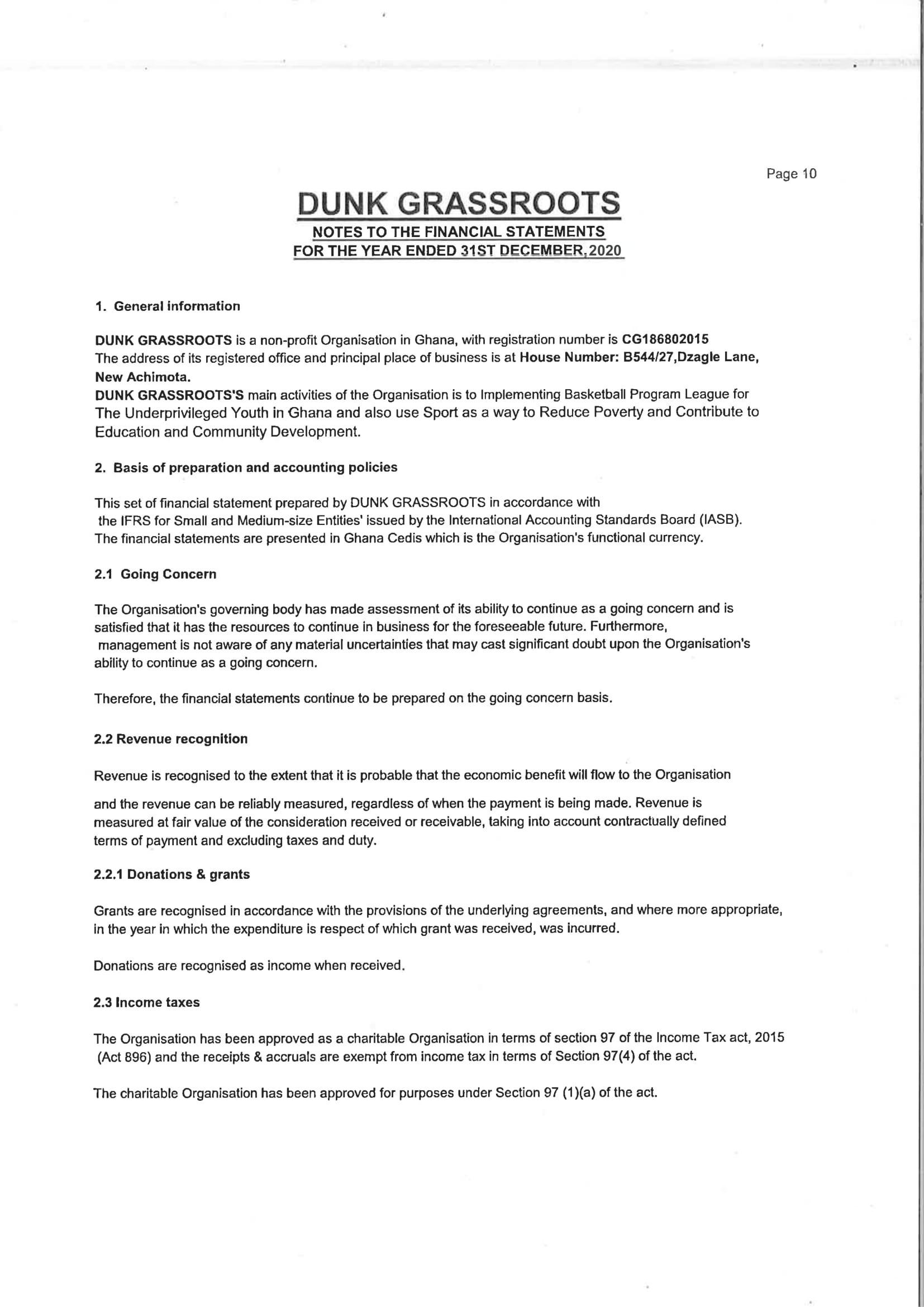 "It gives me great pleasure to present the Annual Report for DUNKGRASSROOTS for the year ending 30 December 2020. It was a challenging but also rewarding opportunities year for our organization. Despite the challenges of Coronavirus, the year finished with total revenue of 556,204.29Ghc and a rollover of 71,577.62Ghc. The impact of Coronavirus was significant, with our centres shut for ten weeks and all valid projects halted, including the funding stream. During this time, we continued to provide services to the community with relief materials. Once the centres reopened, we continued to provide a safe and inclusive venue for the community and we also adapted to digital learning for students. Thank you to all members during this time. We are continuing to assess all possibilities and will keep the members informed as these opportunities are realised"