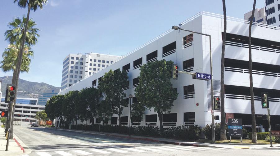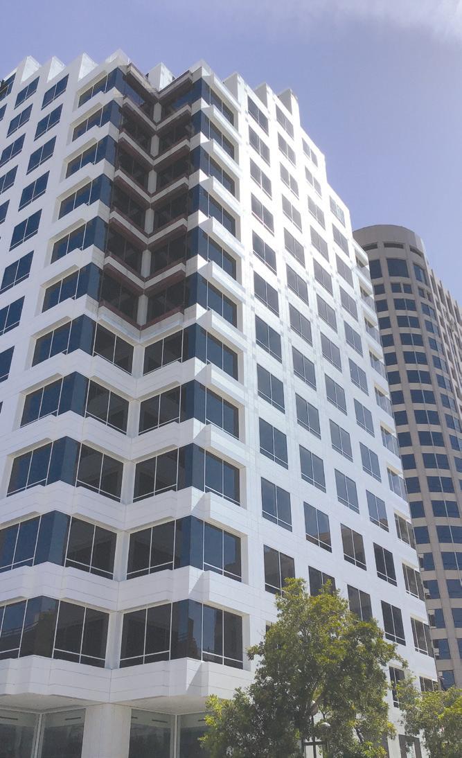 Este edificio de oficinas de alto nivel de 18 pisos ubicado en Glendale, CA, tenía un aspecto anticuado. Junto con otras mejoras, se solicitó un repintado exterior completo. El edificio era principalmente de hormigón vaciado en posición y estuco liso; los paneles de granito cubrían alrededor del 20% del edificio. Cuando las especificaciones originales del fabricante de la pintura fallaron en las pruebas al aplicarlas a los paneles de granito, se llamó a PSI para que desarrollara un sistema que funcionara y pudiera cumplir la garantía original de 10 años de los materiales. “Mi representante de Dunn-Edwards y su equipo trabajaron para encontrar un sistema en el que no tuviéramos problemas con las garantías”, dijo Romero. El nuevo sistema incluía la aplicación de la crema de grabado Etch-I-M de X-I-M y su correcta eliminación, para después aplicar el imprimador de mampostería/adherente Dunn-Edwards SUPER-LOC ® de primera calidad, seguido de dos capas de la pintura exterior EVERSHIELD ® de primerísima calidad de la empresa en semibrillante. El nuevo sistema funcionó tan bien que se contrató a PSI para pintar el edificio de 18 pisos y el estacionamiento adyacente de 5 pisos.