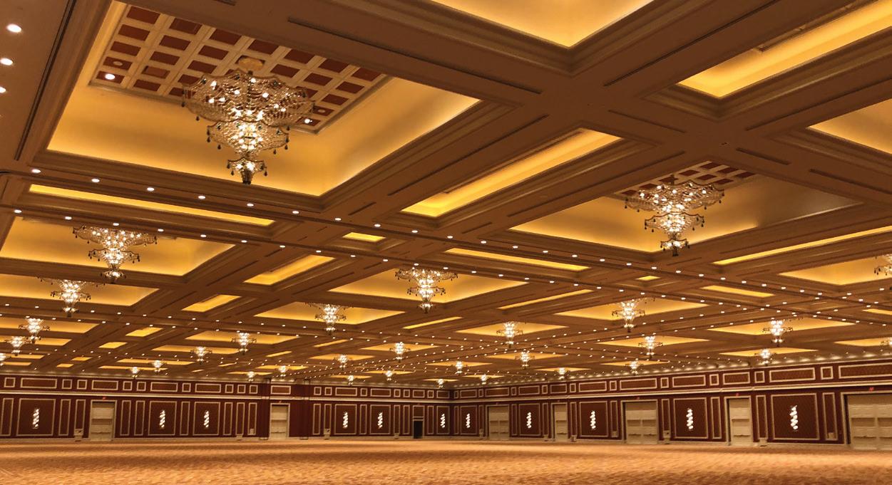 Este proyecto de ampliación de 430,000 ft2 incluyó salas para reuniones, salones de baile, espacios para reuniones previas, un paseo peatonal y más, algunos de ellos con paredes de 45'. KHS&S terminó todo el proyecto con productos Dunn-Edwards. Empezaron con el imprimante ULTRA-GRIP Select para interiores, que terminó siendo ideal para el Sr. Kephart, ya que es un imprimante para múltiples superficies, y trabajaron en varios sustratos que incluyeron paneles de yeso, trabajos de carpintería y yeso reforzado con fibra de vidrio (GRFG, por sus siglas en inglés). Además, Kephart agregó que fue bueno usar una capa continua de imprimante sobre la que se aplican las capas finales.