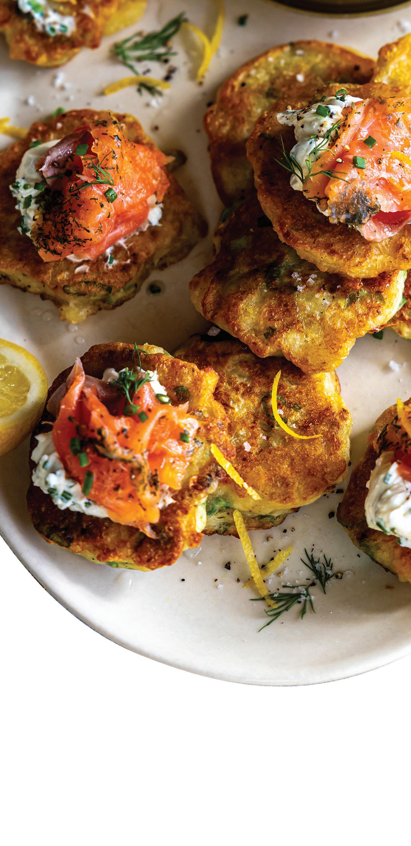 classic. Instead of the usual blini, these little pancakes are made with a traditional boxty batter giving you a crisp bite that makes them that bit more hearty. Perfect topped with smoked salmon, crème fraîche and a squeeze of lemon. They look the part for entertaining, but they’re simple enough to whip up in batches and have as part of your Christmas breakfast.