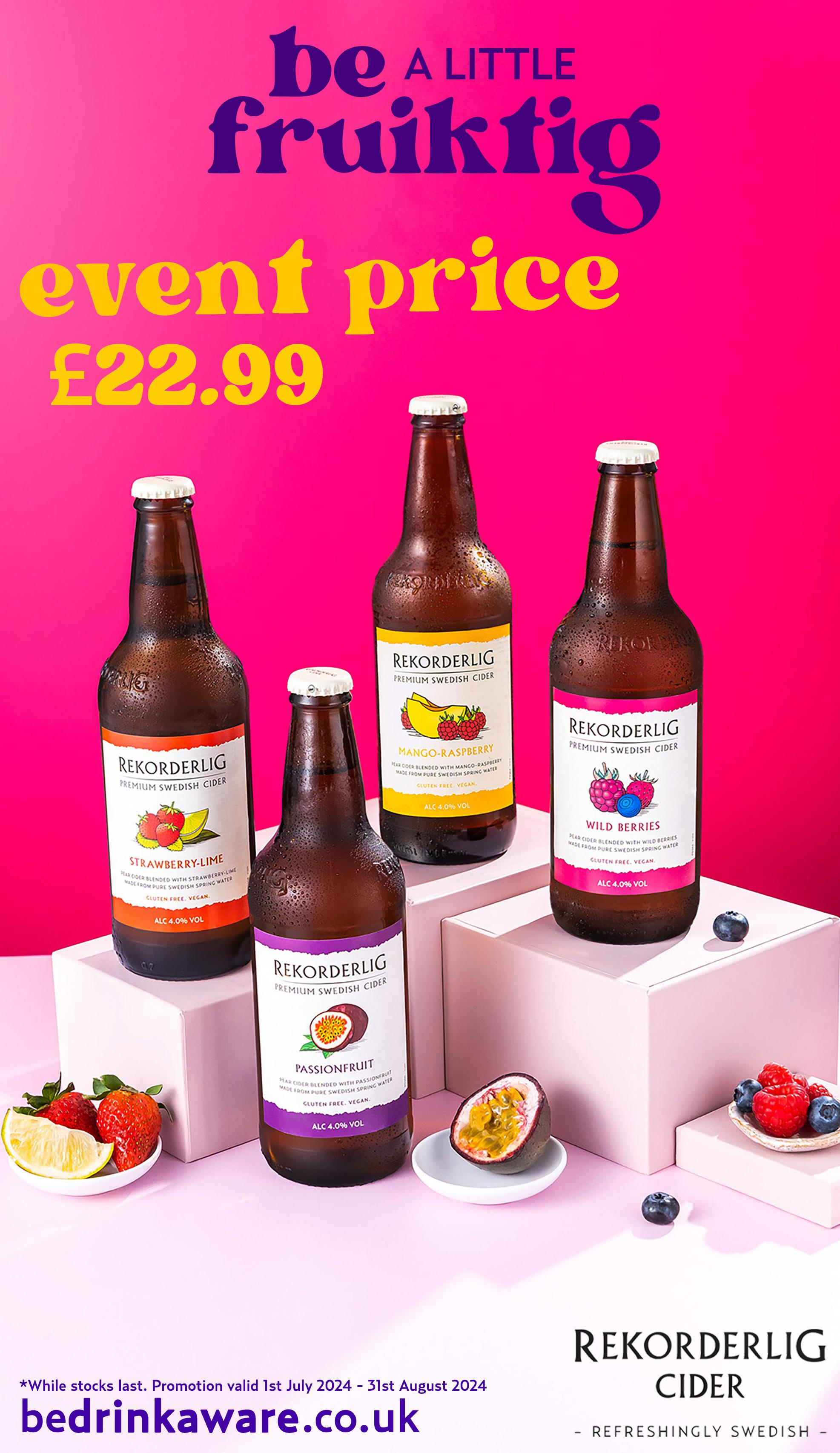 Promotional period 01.03.24-30.04.24. Packaged fruit cider includes 15 x 500ml cases of Strawberry & Lime and Mixed Fruit. While stocks last.