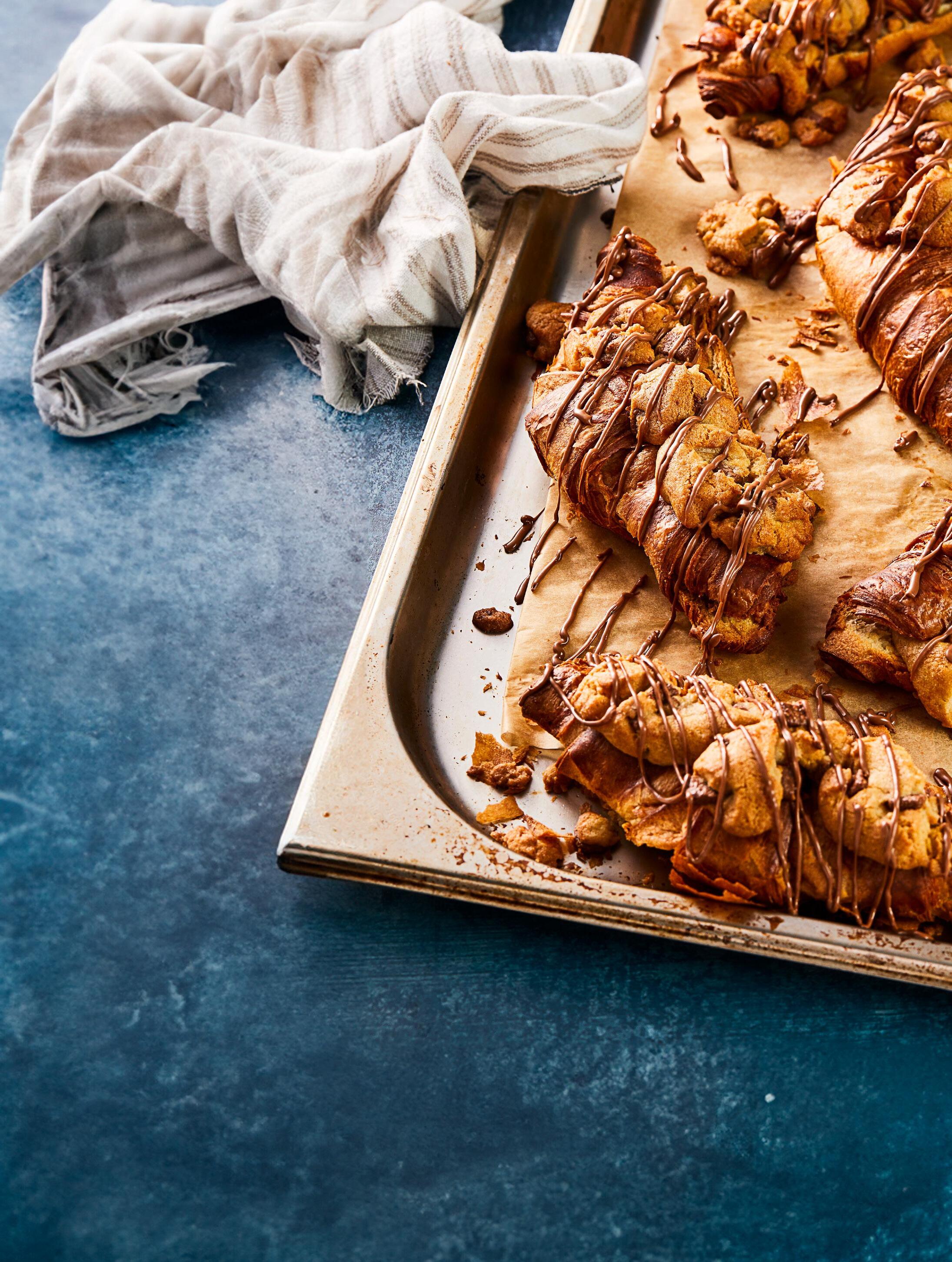 5. Melt the chocolate in a bain marie and then drizzle on top of each crookie.