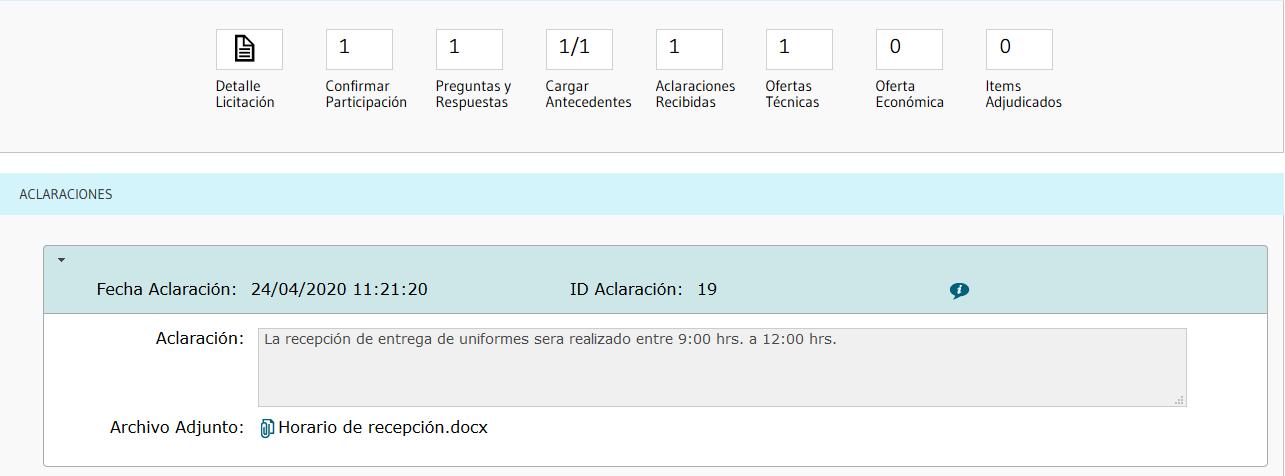 Paso 11: Para revisar la aclaración debe hacer clic sobre la barra celeste. Para descargar archivo adjunto debe clicar en el icono de Clip con la hoja.