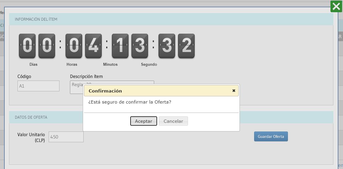 Paso 13.2: A continuación, se despliega la pantalla de confirmación de la oferta. Revise en detalle el valor ingresado, en caso de que esté correcto presione el botón Aceptar.