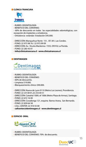 • RUBRO: ODONTOLOGÍA • BENEFICIO DEL CONVENIO: - 60% de descuento. - Limpieza $19.000. - Blanqueamiento clínico $90.000. • DIRECCIÓN: Nueva de Lyon 0110 (Metro Los Leones), Providencia. • FONO: 22 23138 01,22 233 04 51 • DIRECCIÓN: Catedral 1009, of 1006 (Metro Plaza de Armas), Santiago. • FONO: 22 672 16 00 • DIRECCIÓN: Covadonga 121, esquina Barros Arana, San Bernardo. • FONO: 22 859 64 58 • CALL CENTER: 22 410 55 00 • callcenter@dentimagen.cl • www.dentimagen.cl ESPACIO ORAL