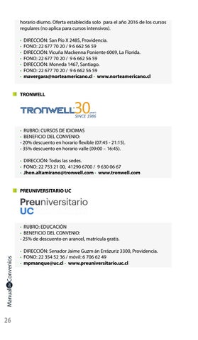 • RUBRO: CURSOS DE IDIOMAS • BENEFICIO DEL CONVENIO: - 20% descuento en horario flexible (07:45 - 21:15). - 35% descuento en horario valle (09:00 – 16:45). • DIRECCIÓN: Todas las sedes. • FONO: 22 753 21 00, 41290 6700 / 9 630 06 67 • Jhon.altamirano@tronwell.com • www.tronwell.com PREUNIVERSITARIO UC