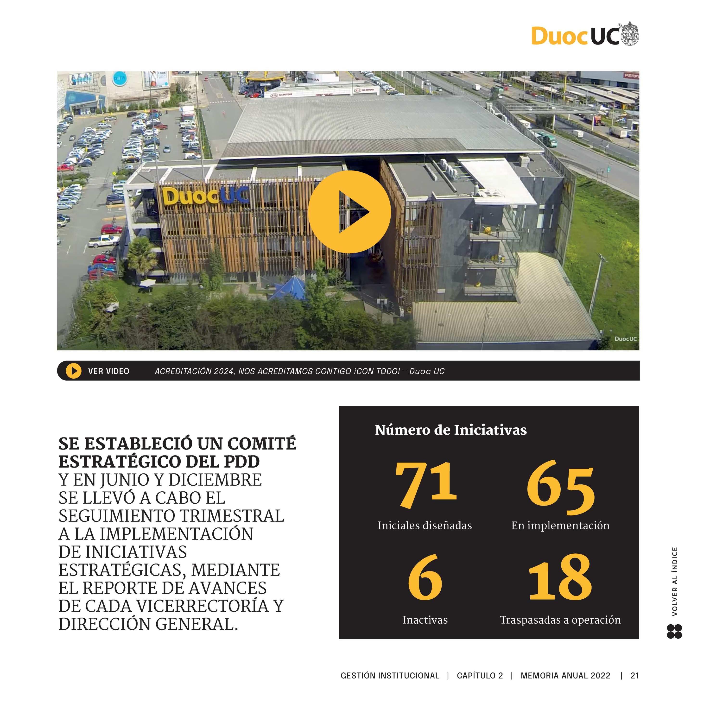 Gracias al compromiso, generosidad y entrega de todos los miembros de nuestra comunidad, el 2022 pudimos seguir avanzando en la implementación de la que ha sido nuestra hoja de ruta, el Plan de Desarrollo 2021-2025. Con el foco puesto en que las personas estén siempre al centro, las iniciativas estratégicas se orientaron en el mejoramiento de la progresión estudiantil, aprendizaje, titulación, formación continua,