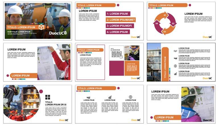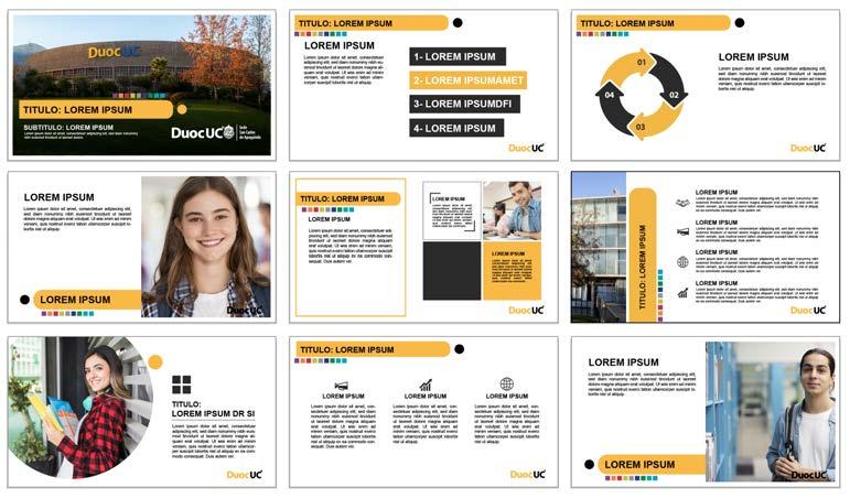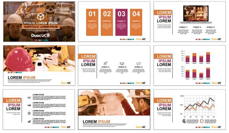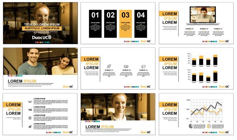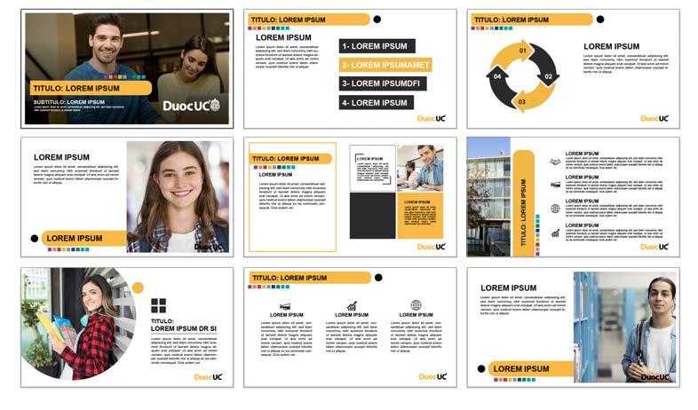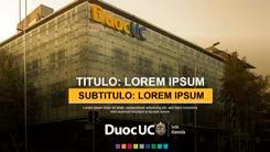 La plantilla para LCD muestra la ubicación correcta de los elementos en esta pieza. Debe estar presente el logo, RRSS de la escuela o de Duoc UC y el sitio web.