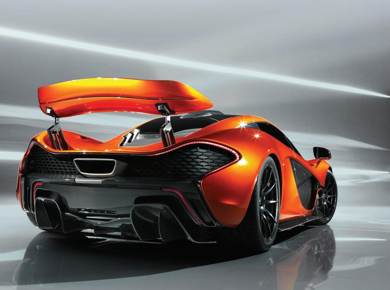 The P1’s body incorporates active aerodynamics, including an airbrake spoiler, and the ability to be lowered by 50 millimeters in its race setting. McLaren’s interlinked hydropneumatic dampers can also be sti ened by up to 300 percent in this mode, making the P1 hugely capable on a racetrack, yet still su ciently supple for road use.