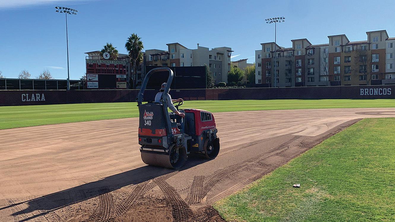 7. 1.5トンのローラーを使って、内野を転圧する。2つの直角方 向に転がす。