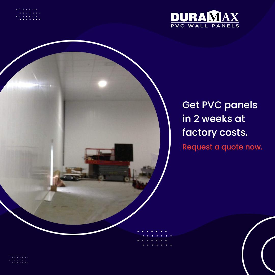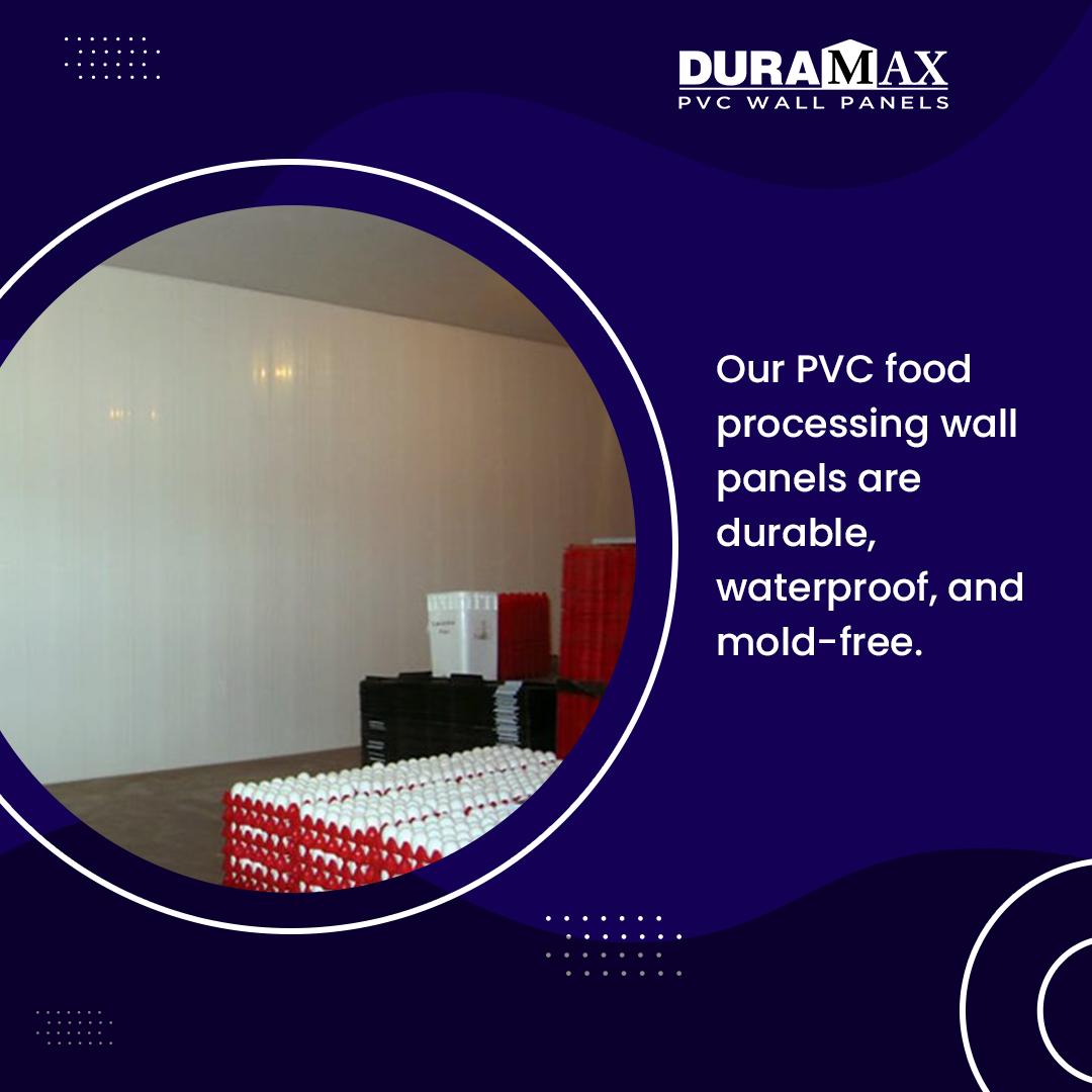 Welcome to Duramax PVC Panels. Stop moisture damage by installing meat packaging wall panels made from virgin vinyl. Commercial facilities require PVC food processing wall panels as they are durable, mold-free, and water-resistant. In addition, the low-maintenance washable wall panels last 45 to 50 years with no callbacks. Get PVC wall materials in 2 weeks at factory-direct costs. Request a quote now.