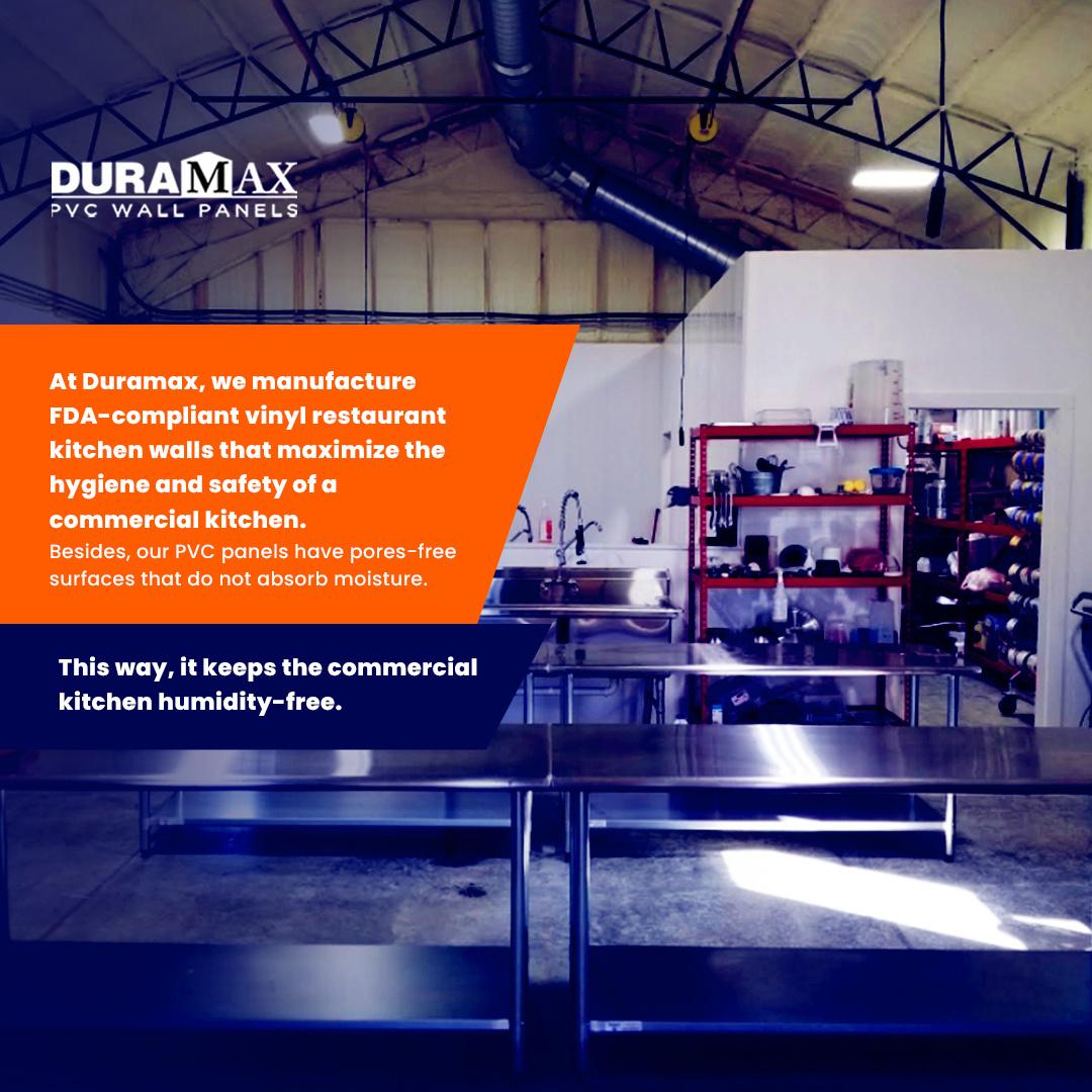 Welcome to Duramax PVC Wall Panels. We are one of the finest vinyl commercial kitchen walls in the USA. We take pride in providing hygienically safe and waterproof vinyl commercial kitchen walls. Duramax provides FDA-compliant and ASTM-certified vinyl restaurant kitchen walls that meet or exceed hygiene standards. Furthermore, Duramax PVC panels have pores-free surfaces that do not absorb moisture. Duramax vinyl restaurant kitchen walls are pricy than FRP panels kitchen. For more: 323-792-1269