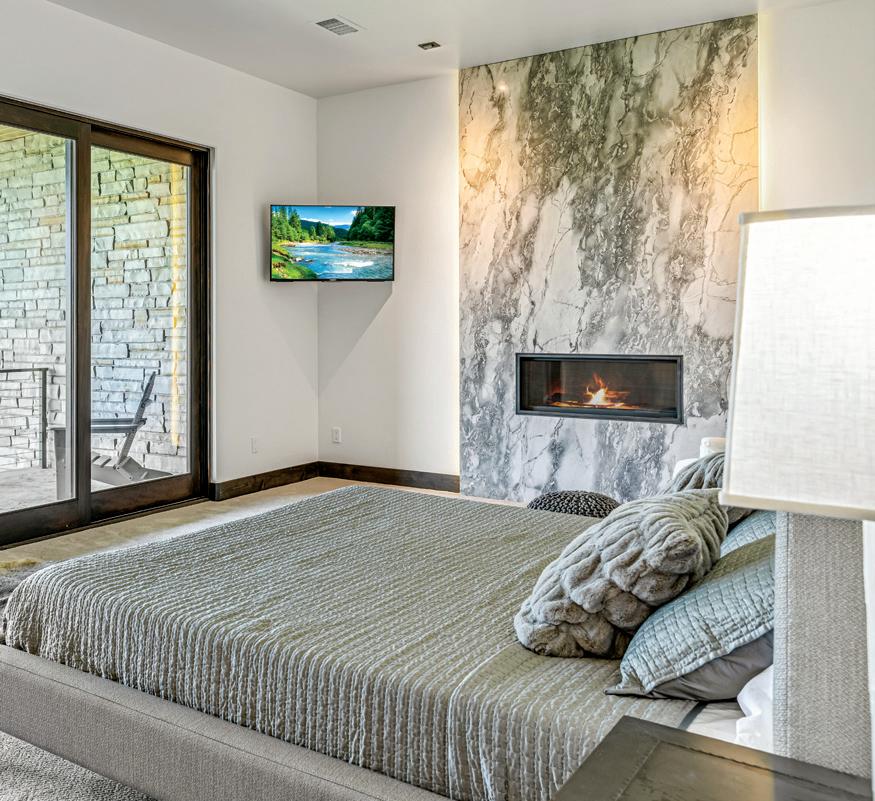 This project also brought the sense of collaboration and teamwork that is a hallmark of RA+A’s firm. “Our office has architects and engineers working together. That’s the advantage to having this kind of team. Instead of holding back on a design because of material, you can get an answer immediately as to whether or not it will work. It lets you be a little more creative.” Collaboration with the client was also incredibly important in the design of this home, as each individual had a different vision. Listening to the client, observing images or ideas they provide, and building a relationship contributed to the creativity in both design and building materials. Reynolds, Ash + Associates worked closely with contractor Vernon Lesley, who is a longtime friend of Ash, to execute the vision of the homeowner from the views to the natural materials. In the living room, a floor-to-ceiling piece of glass provides a picture frame into the surrounding national forest. A massive fireplace anchors the dining and kitchen area, spilling its light into the cozy living room. The three-sided fireplace was built by working scrupulously with the contractor to get it just right, picking out each stone by hand and ensuring that the “feel” of the room was inviting. Flow was important to the homeowners, bringing a feeling of togetherness and warmth to every space. Pushing the limits of design, the downstairs features a bar and entertainment area, while the bust of a bighorn sheep keeps an eye on the pool-table proceedings. An LED wall was a quirky feature that the homeowner and contractor Vernon Lesley worked together closely to create: The stone comes forward off the wall and creates a sense of movement and light, which can change color depending on the preference of the occupants at any given time.