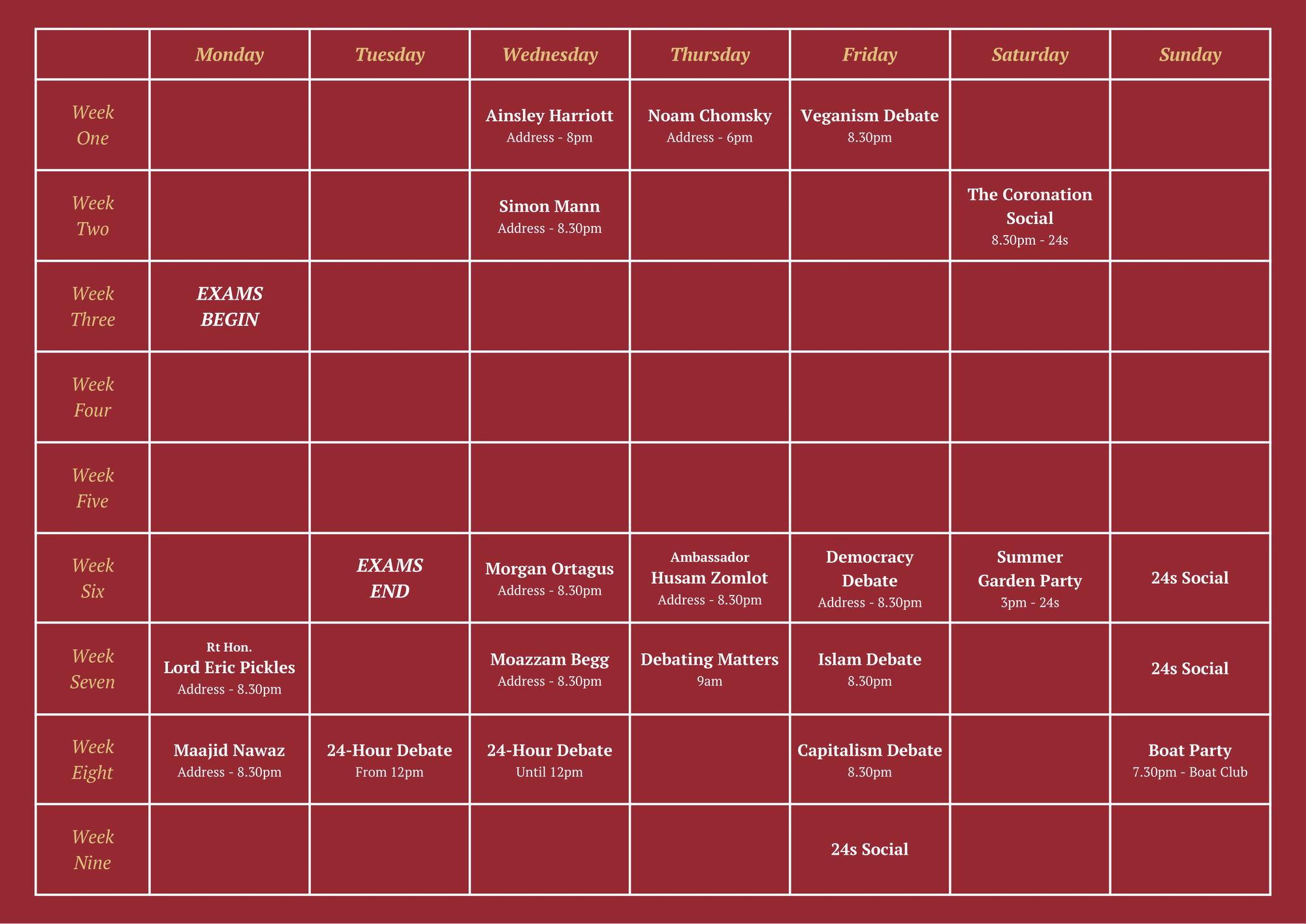 This term, our fantastic programme of addresses, debates and socials will hopefully sway the bittersweetness of Easter markedly to the sweet. Whether it's a reprieve from studies through an evening with Ainsley Harriott before exams or debating the state of democracy thereafter, I sincerely hope you join us for what promises to be a term rife with thought-provoking and stimulating events.