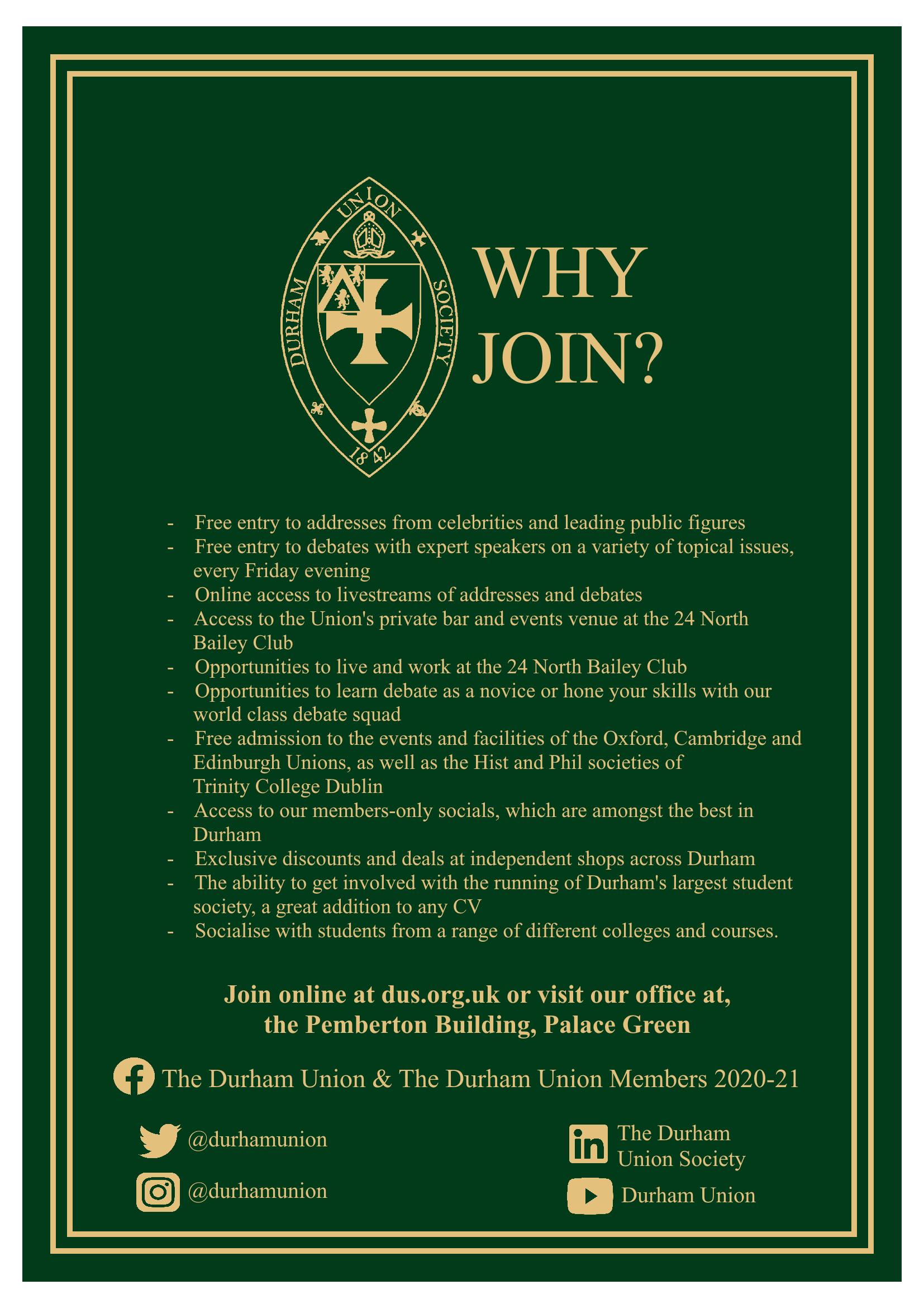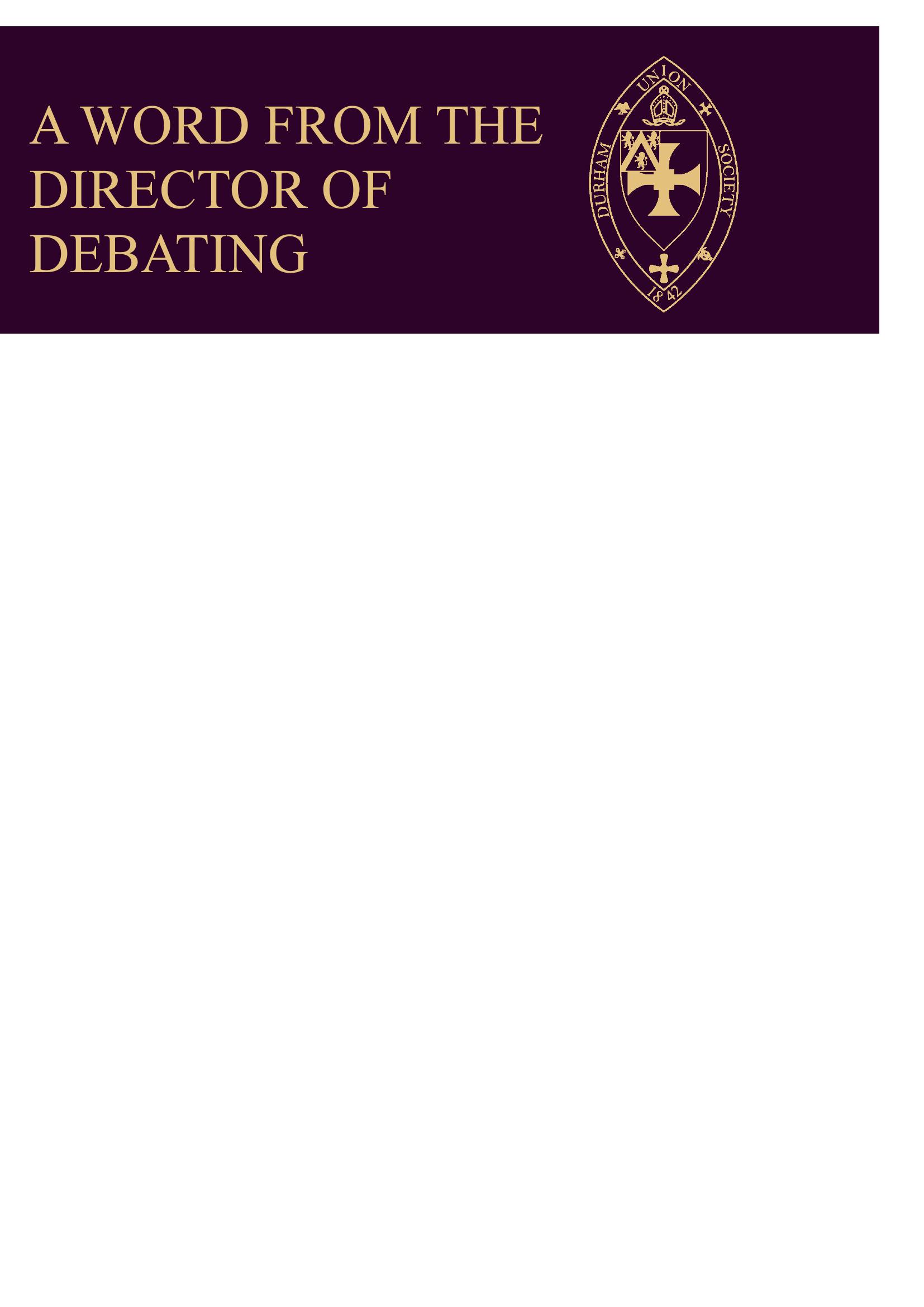 Debate will be taking a new approach this term. Due to the current restrictions in place, training sessions will be held online through Zoom as well as most competitions. Socials will also be virtual for the time being, and we will be releasing more details regarding our socials on our Facebook page âDurham Union Debatingâ.