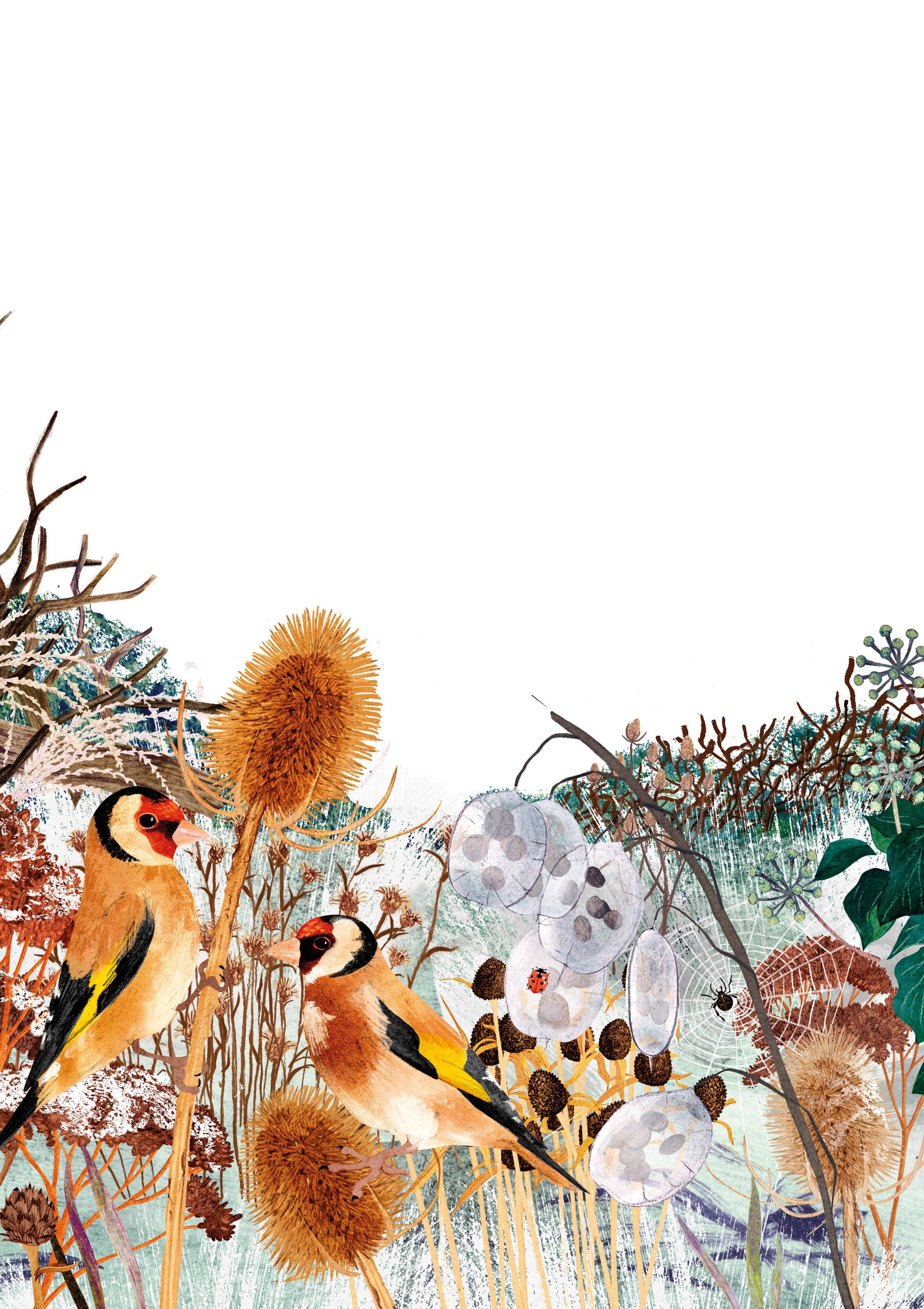 teasel seed heads. Their long, needle-like beaks root around for the small seeds. On frosty mornings, the seed heads sparkled silver in the low light – a truly enchanting sight.