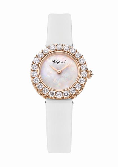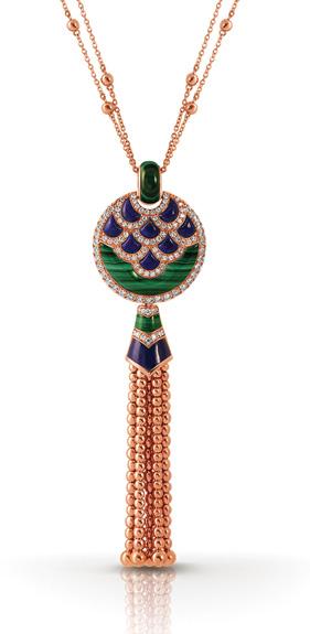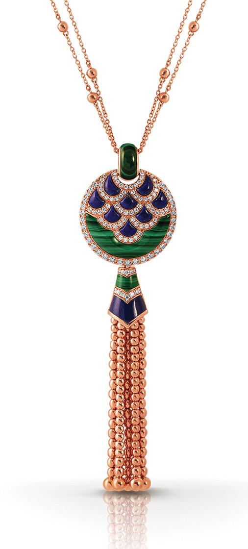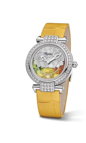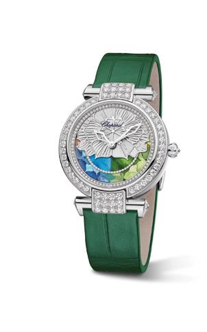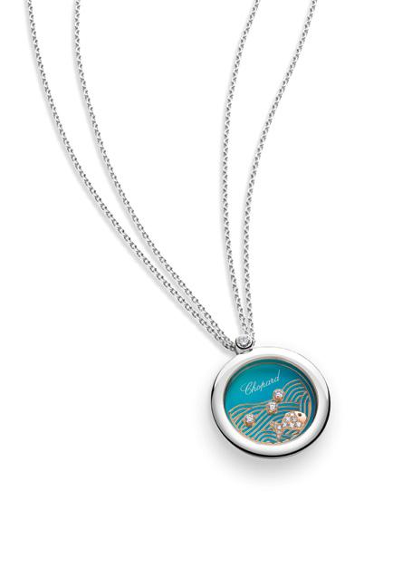 This 36 mm Happy Sport model in Lucent Steel™ and ethical rose gold features a turquoise mother-of-pearl dial with dancing diamonds and a free-floating fish charm. Paired with a matching pendant, it embodies summer’s poetic oceanic spirit.