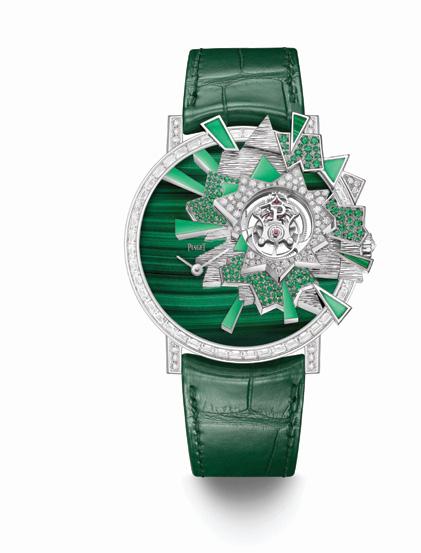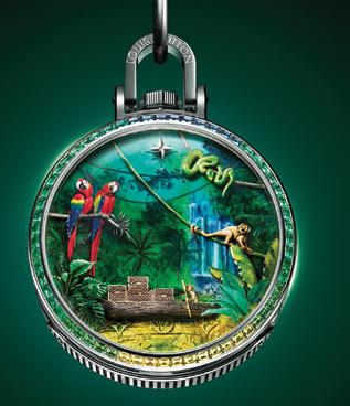 Louis Vuitton’s Escale en Amazonie pocket watch blends automata, tourbillon, and minute repeater complications. Featuring 15 animated dial elements, enamel artistry, and trunkinspired motifs, it is the maison’s most complex watch to date, celebrating exploration with over 1,000 hours of craftsmanship.