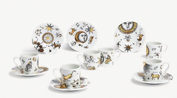 A collectible set of six porcelain cups adorned with zodiac motifs and gold accents. Each piece is hand-decorated, with slight variations that attest to artisanal uniqueness, blending cosmic symbolism with Fornasetti’s timeless artistic heritage.