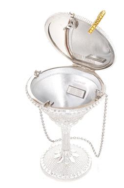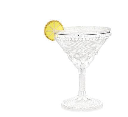 The Limoncello Martini crystal clutch is crafted with interlocking crystal patterns in multiple shapes and sizes. Finished with a playful lemon ornament, this radiant piece is a celebration of whimsy, craftsmanship, and cocktail-inspired luxury.