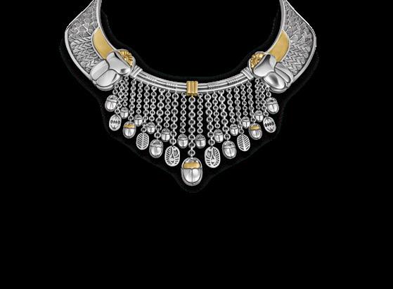 The Scarab Collection reinterprets Ancient Egyptian symbolism through contemporary craftsmanship following twenty-five years of cultural exploration. Inspired by rebirth and protection, pieces incorporate motifs like the Shen symbol, Horus wings and solar elements. Highlights include the Tutankhamun Necklace, Winged Scarab Cuff and lattice-work bracelet. Each creation reflects heritage, artistry and spiritual meaning, transforming ancient motifs into modern, expressive jewellery.