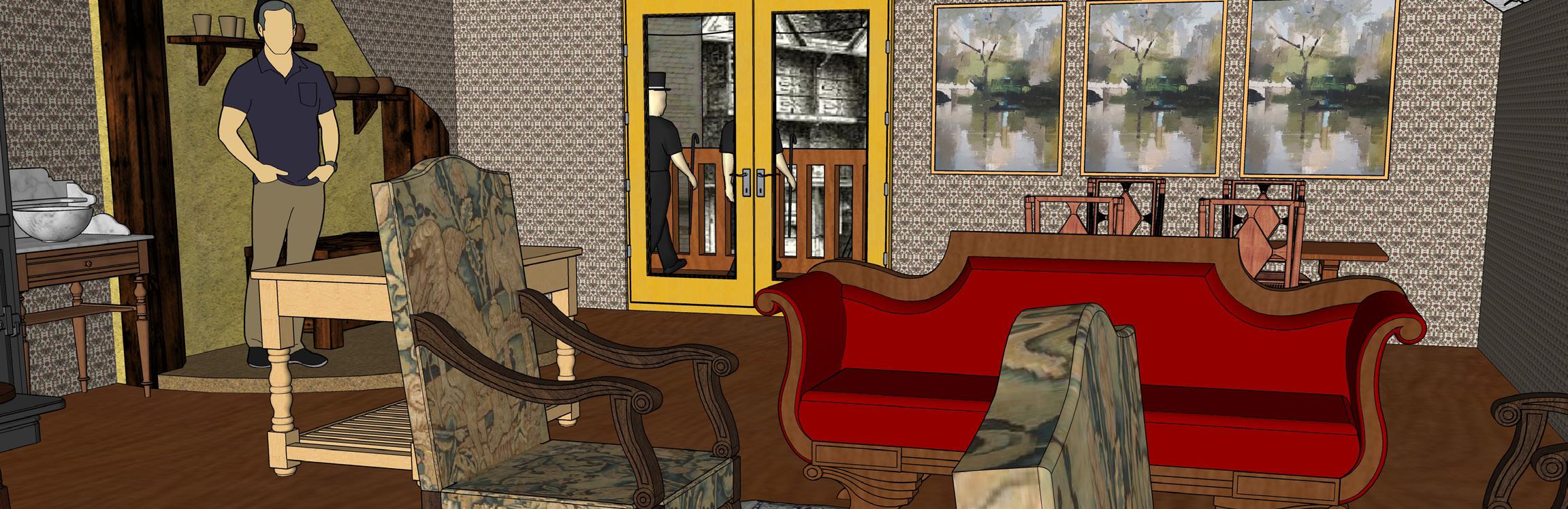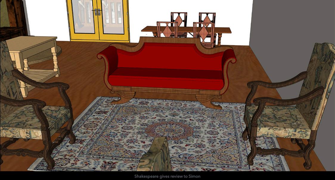 In the apartment we see a somewhat more typical scene. We will have period furniture with tradition period colors, textures, and styles. This needs to feel like it is a comfortable place, separate from the uncomfortable odd museum artifacts. This is also where Shakespeare will bring is collaborators. So the space needs to be large enough for 6-8 other people and fit them comfortably. The apartment and the museum will feature a traditional style wallpaper. This is an important connecting element as it will provide color and texture that is common to both interior spaces.