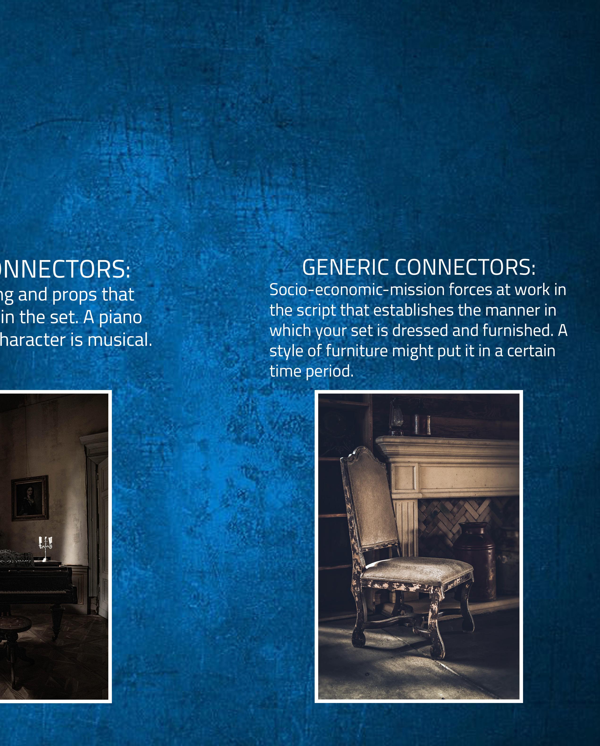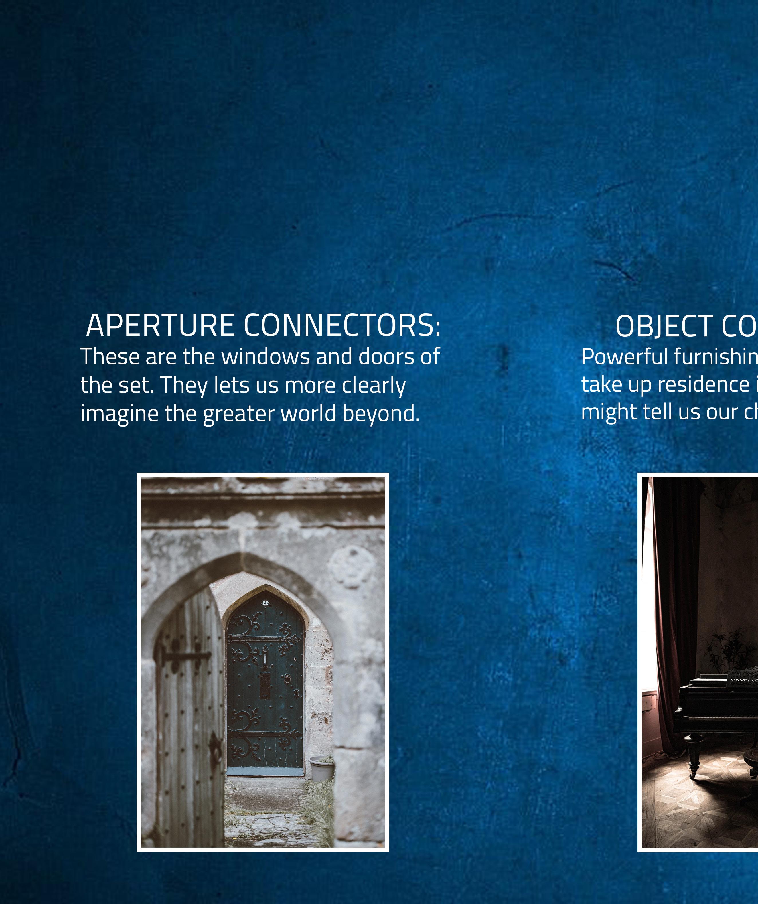 It's important to start thinking about how things connect and relate. Windows and doors imply a larger world outside the environment of our set. We would expect to see and hear something through those apertures. Windows and doors give us a glimpse that there is a larger world to our story. Stairs hint at vertical space that our characters live in. Props, decor, and ornamentation tie spaces together even if they are not connected in our physical world they maybe connected in our characters world.
