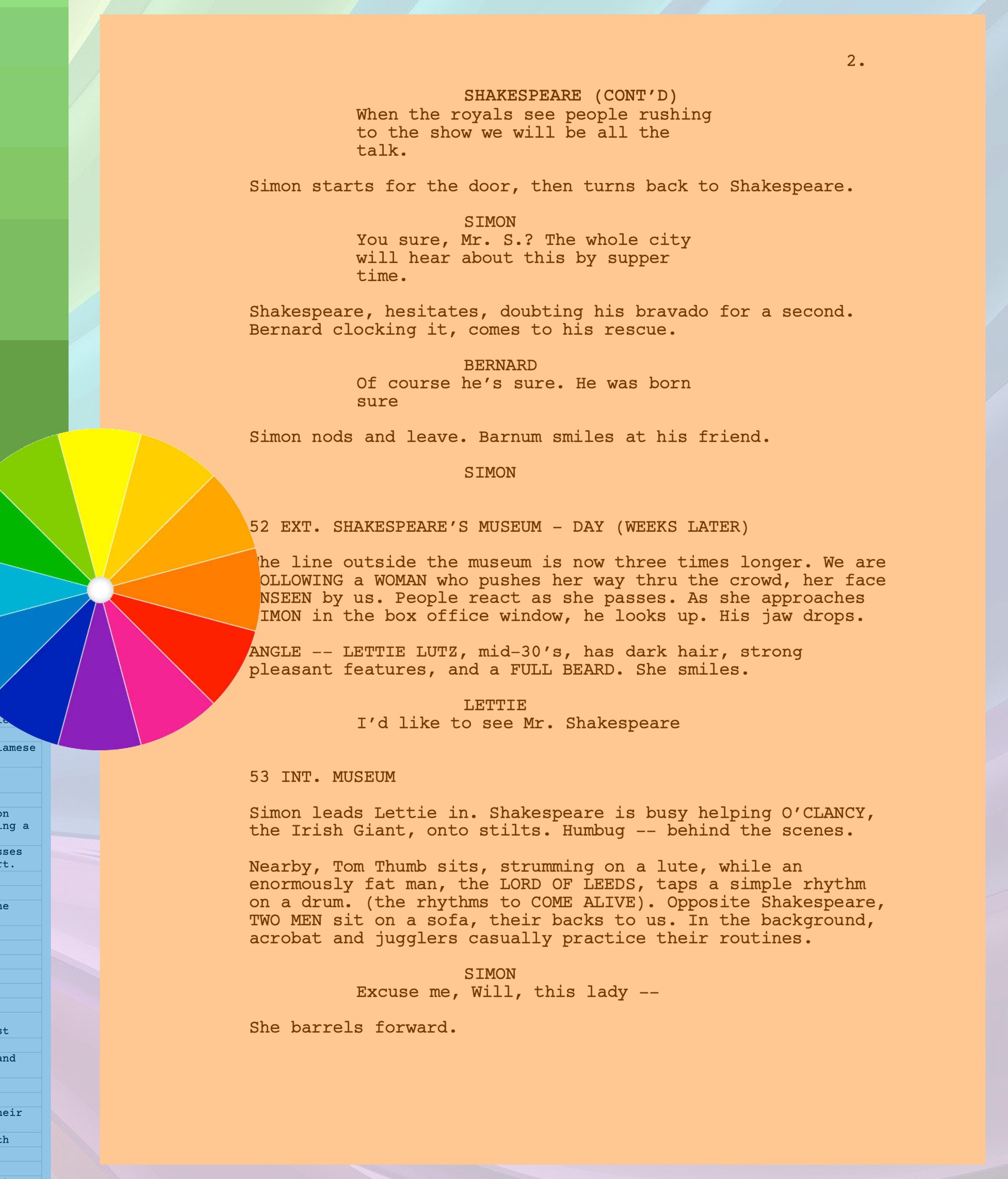 1585-1592 There is a period where historians cannot account for the life of William Shakespeare. That is until the journal of Nathan Bradshaw, was uncovered just this last year, a member of Shakespeare’s “Montague” Troupe. In this journal we learn the truth of Shakespeare’s start in theater, and the real first time that The Globe theater burned down. From a poor past and a desire to prove himself to the courtesans in London, our protagonist, William Shakespeare begins working for a small museum as a clerk. Tragically the museum owner, Lord Chamberlain, is lost at sea. Seeing this as an opportunity William claims ownership forging a few documents to make it a reality. Shakespeare begins the process of changing the museum artifacts to the odd and macabre as an attempt to attracts patrons. He continually seeks to add new attractions, so decides to add performing acts to the museum which he slowly renovates to a theater. Being virtually unknown to the current acting community he forms a troupe of unique individuals, the cast down, and deformed but each with a unique talent that he can use as an act in his show, they call themselves the Montagues and form a sort of family. They start seeing great success and sell out all their seats each night. Eventually his fame increases, and he attracts the talent of a well-known acting group, The Capulet’s. Shakespeare’s desire to become rich and famous see’s this as too much of a potential boon for him to pass up. He shuns the Montague’s in favor of the Capulet’s, causing much resentment. He has a grand time showing off the new talent and performs for the King and Queen, and Lords and Ladies all around England and Scotland. Eventually he feels sorrowful for what he has done and abandons the Capulets to head back to London for the Montague’s whom he left behind. The Capulet’s cannot let this stand, and a fight ensues between the two troupe. While all this is happening Lord Chamberlain miraculously returns from his ocean voyage and discovers the fraud and confronts him at the theater. During this confrontation Shakespeare is very contrite and agrees to pay for what he has done by working for the owner as a servant for 5 years. During this negotiation the Montague’s and Capulets fight reaches its climax and a lantern breaks which causes the theater to burn down. The original theater owner rebuilds the theater and Shakespeare works for him as a playwright for the rest of his days.