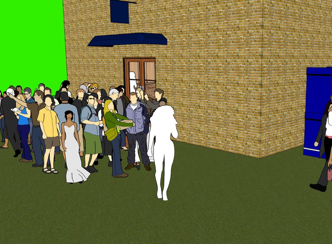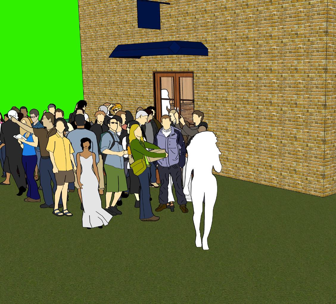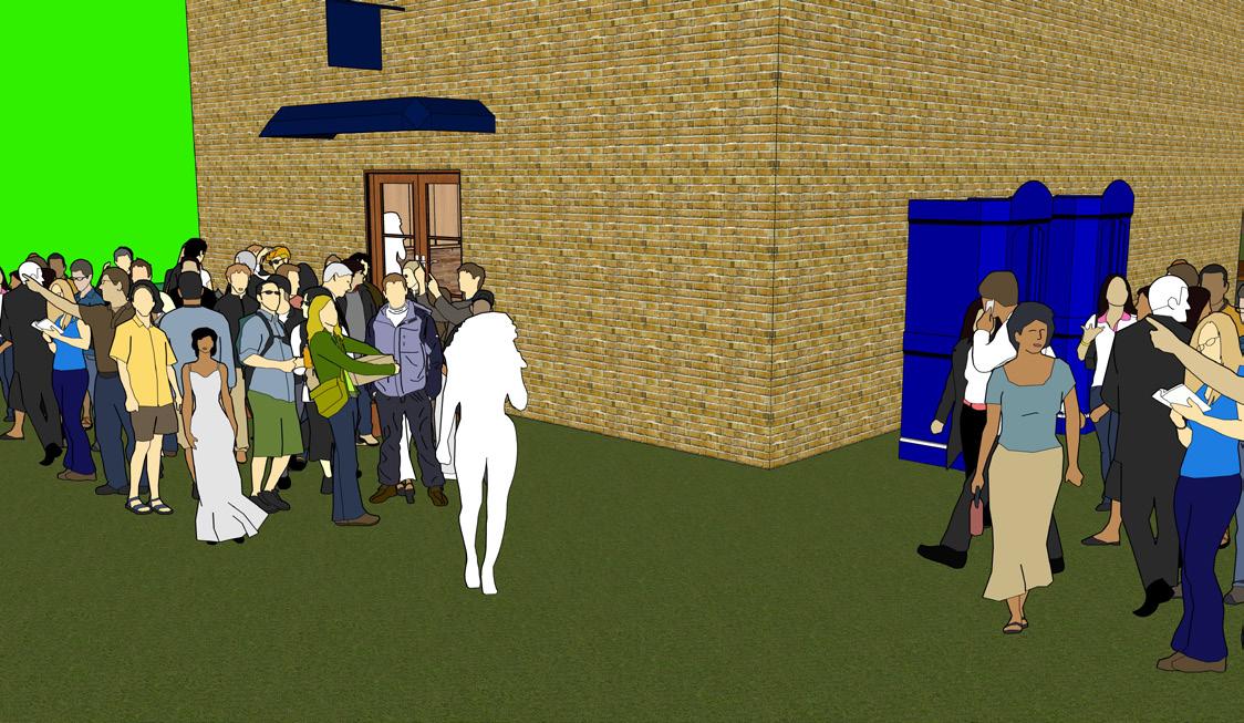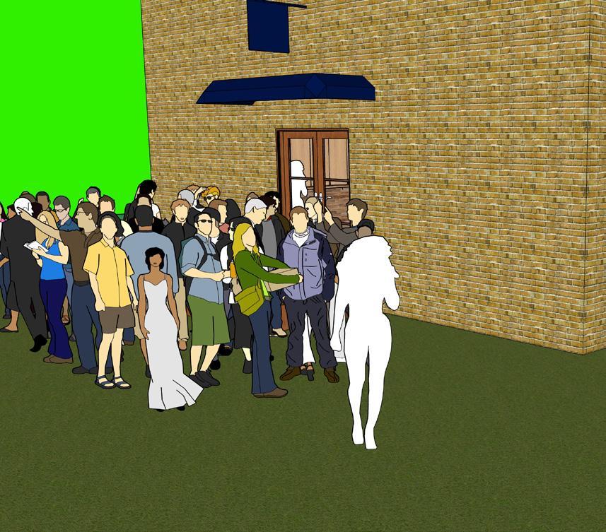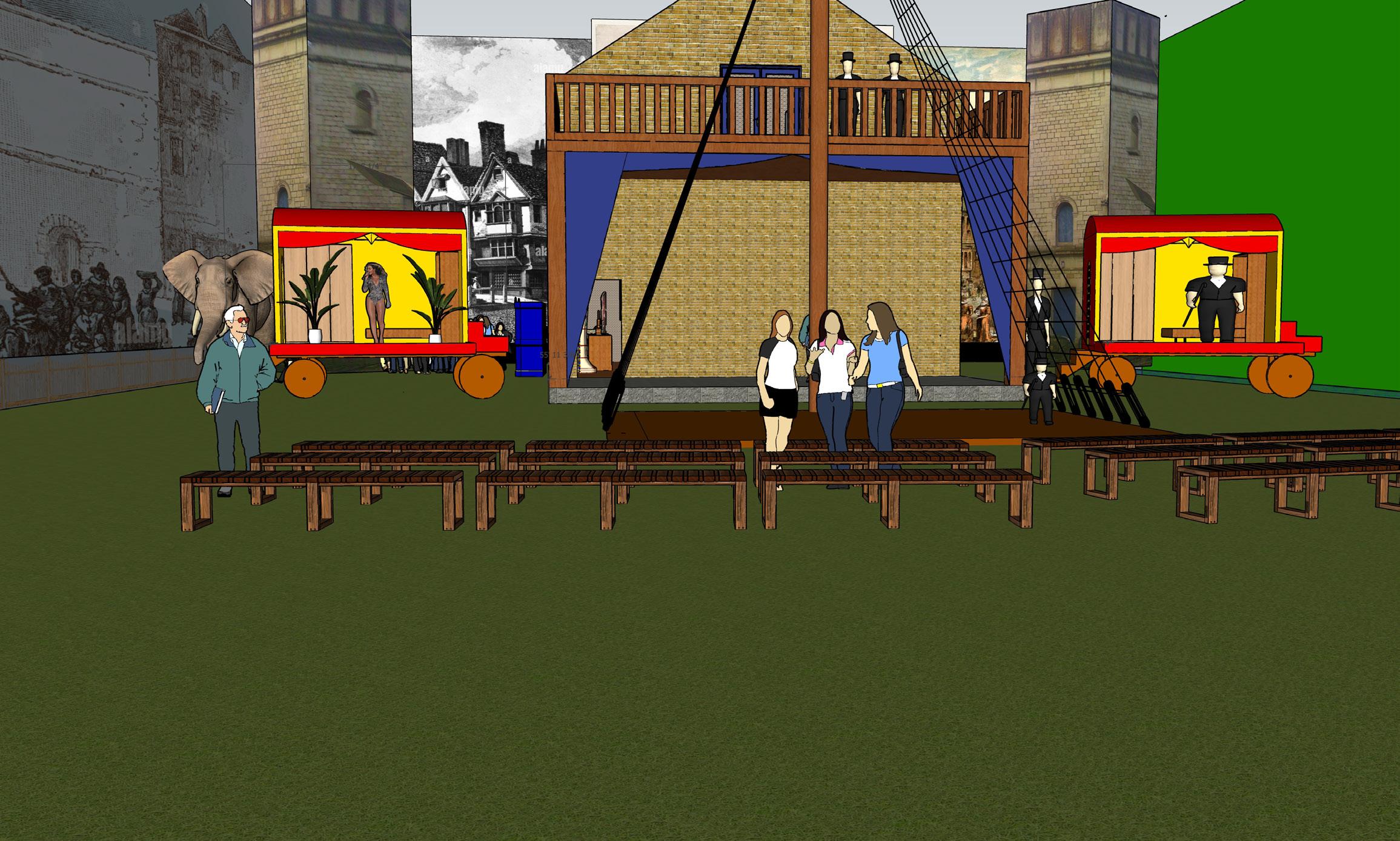 In this frame we can start to see a more detailed view of the stage. On our color wheel browns are of the similar hues as the yellows and reds used in the traveling wagons. In order to contrast with that and start to develop our stage more fully we added some bright blue curtains that would act as our proscenium. This was not typical design for a proscenium at this time but should still fit in our scene because of our emphasis of our oddities and out of place elements. In this shot we can also get a sense of the scale of this area.