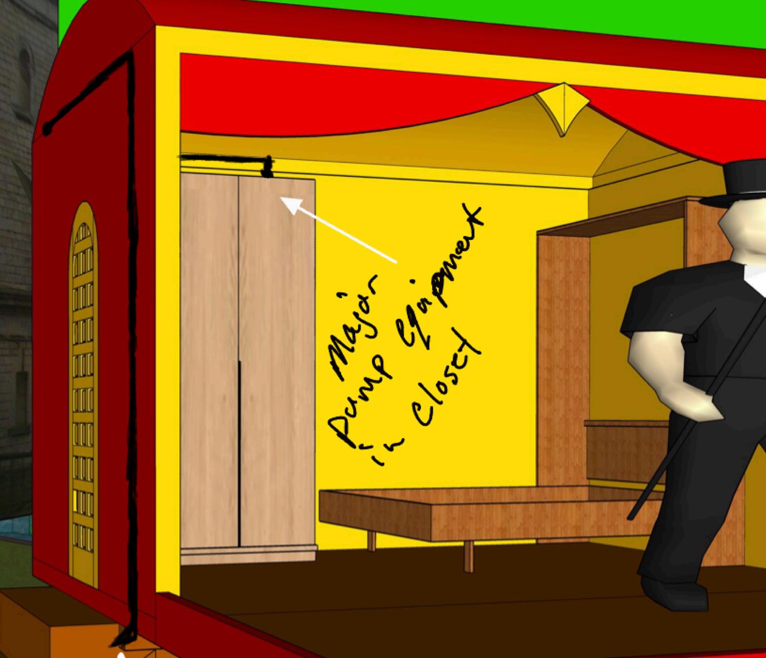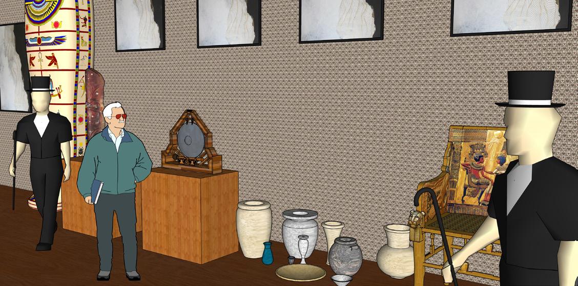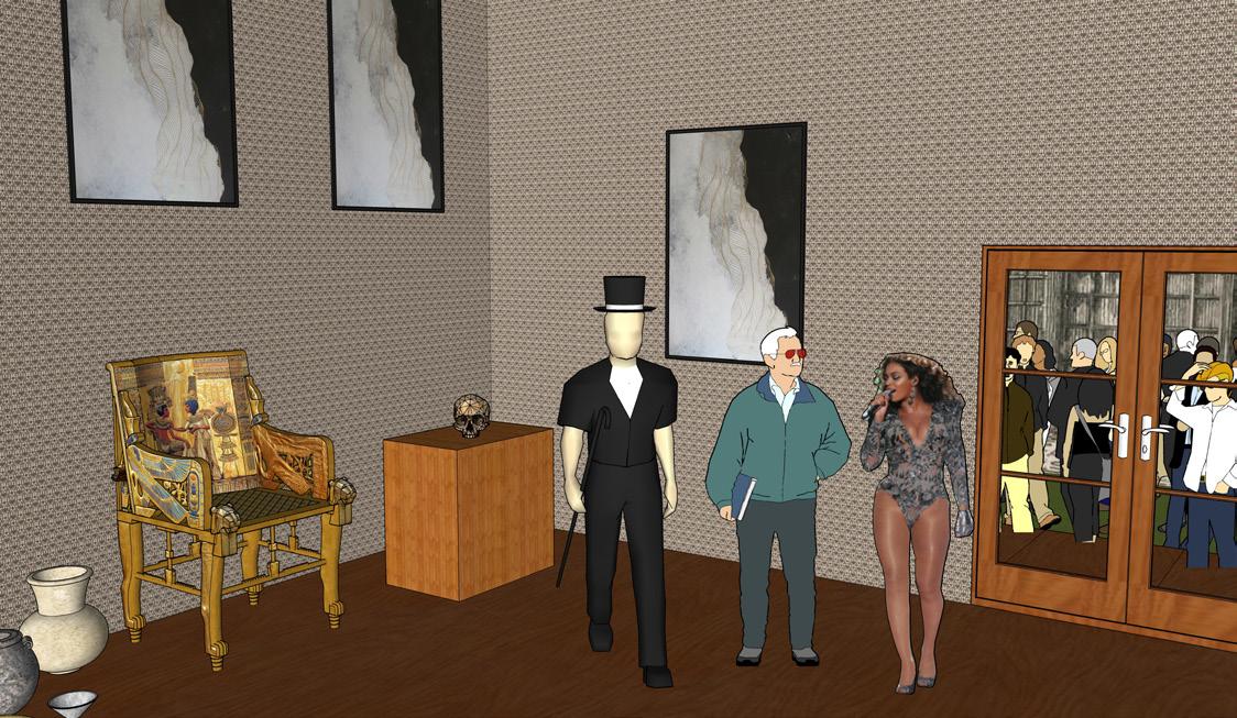 The museum is a utilitarian building 45' long by 30' wide with the stage on the back the museum reaches a length of 55'. There is nothing special about it's design and with he addition of the stage and balcony it looks rather odd like those features are out of place. Inside the apartment it is a single room with several separate spaces as if it was an after thought and not actually meant for that space. You will find a make-shift kitchen, a dining area fit for 6-8 people a living room/lounge area with a couch and a couple arm chairs. Next to the lounge area is Shakespeare's desk. This desk is an important collaboration area for Shakespeare and whoever he needs to work with. In the first floor of the museum you will find display cases with odd displays. Most of the displays you will find ancient Egyptian artifacts including a sarcophagus standing tall, a throne, and Canopic jars. There is also a tribal mask, an animal skull, a head in a jar. Around the walls of the museum you will find strange artwork for the time . These should be something that would controversial anywhere else.