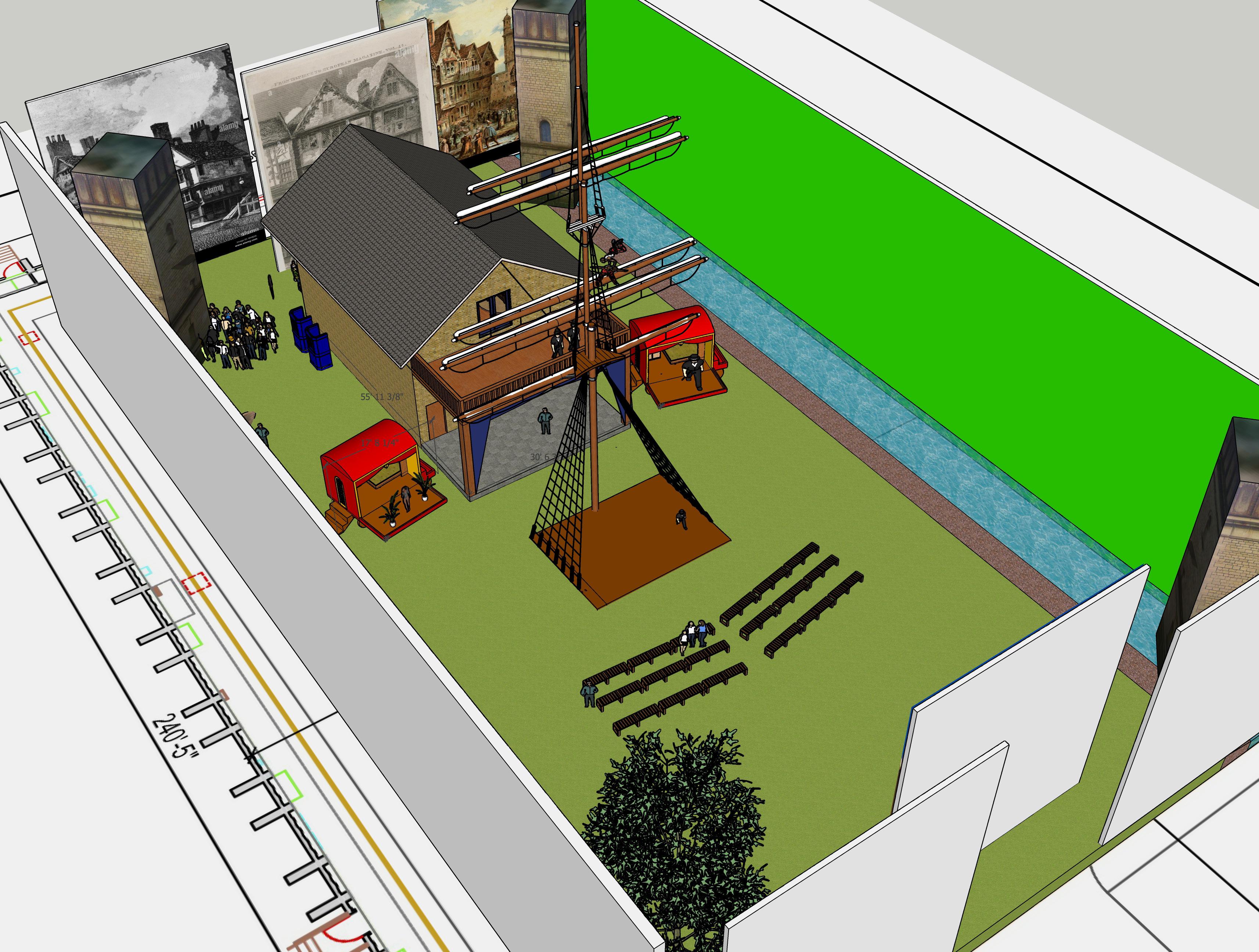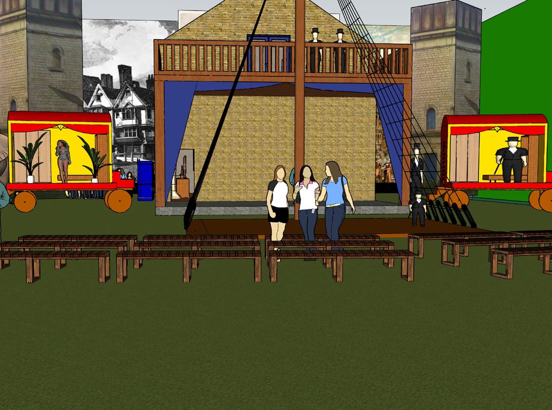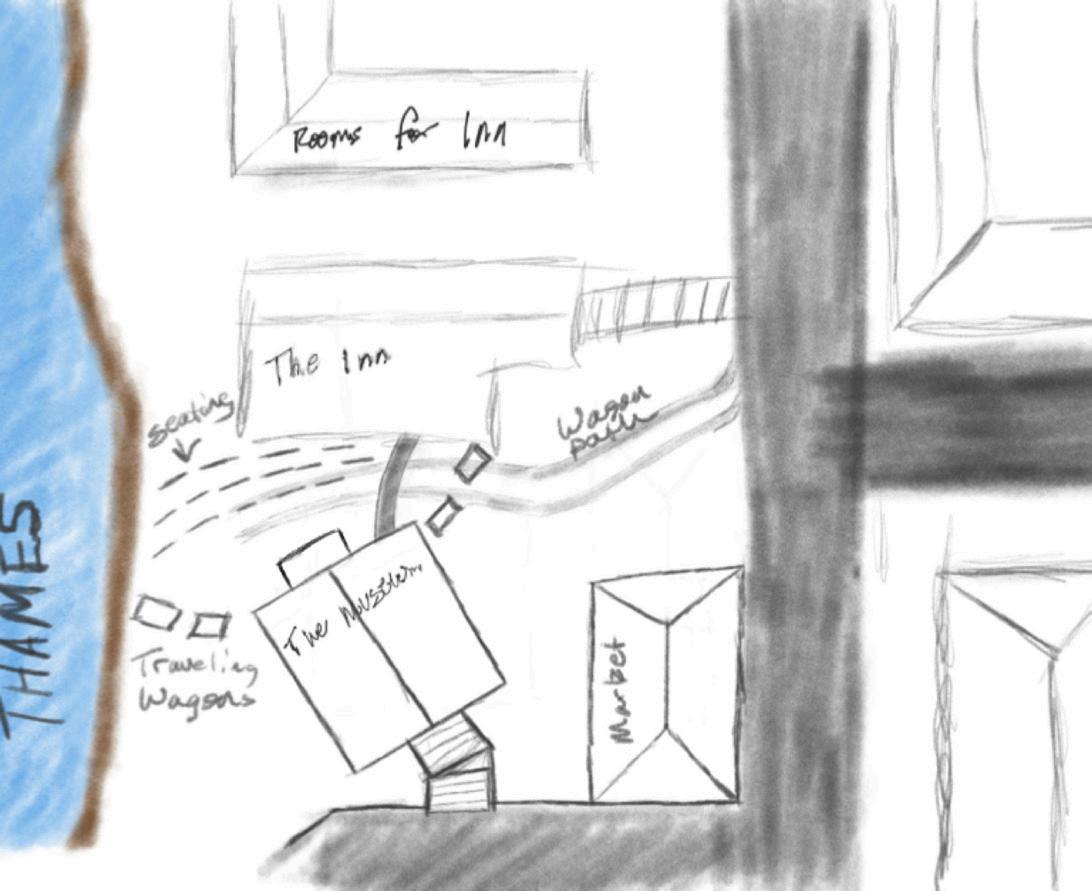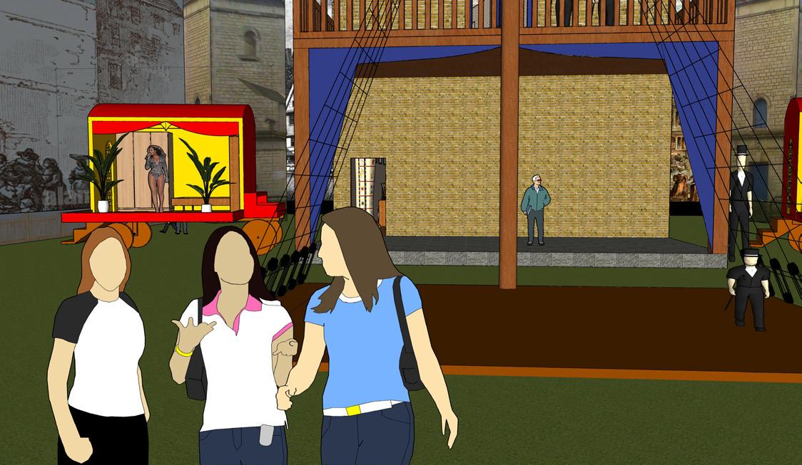 Some very important scenes happen in the second floor of the Museum. This is where Shakespeare lives and dreams up his ideas. This is where we would get a really good idea of who Shakespeare is as a person. This upper space also acts as an entrance and exit to a balcony stage. It is where the acrobats would come to climb up high for their acts. During our scene we would see this space when Shakespeare is learning about the initial review of the acts, and he learns that they are causing some drama amongst the upper class. He enjoys the publicity he is getting from people talking about his performers and wants everyone to know what they are saying so has the town crier shout the review of his play to the masses.