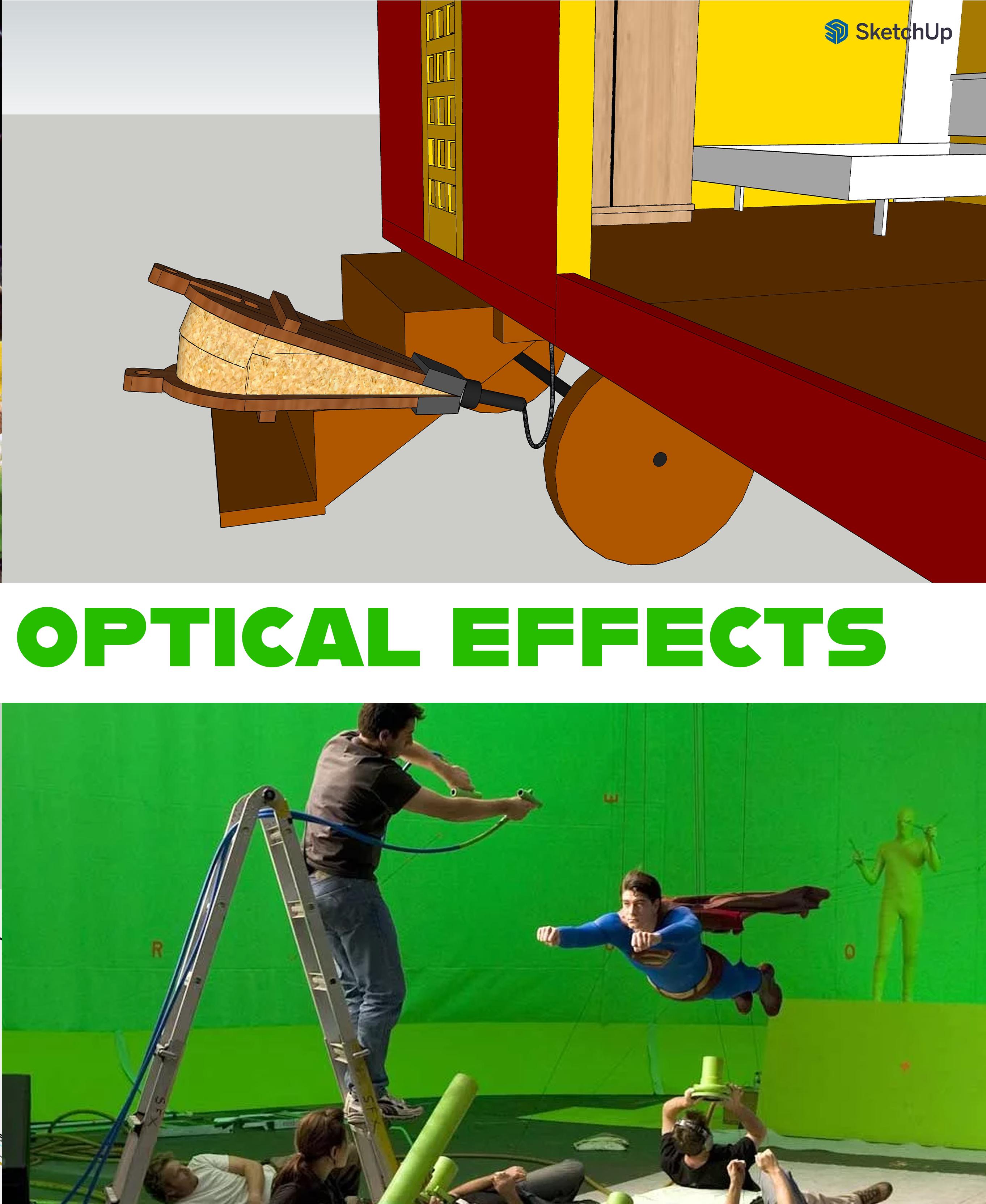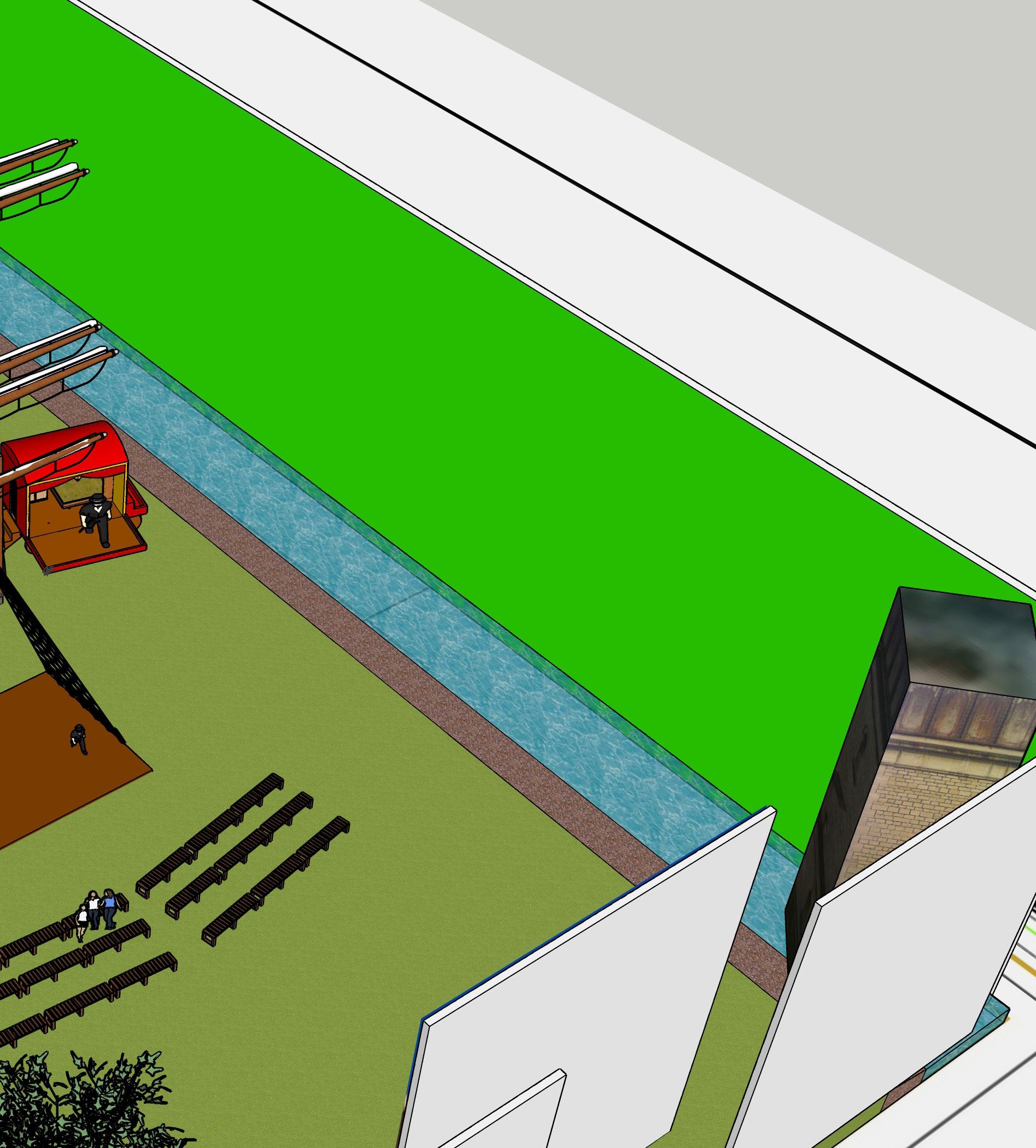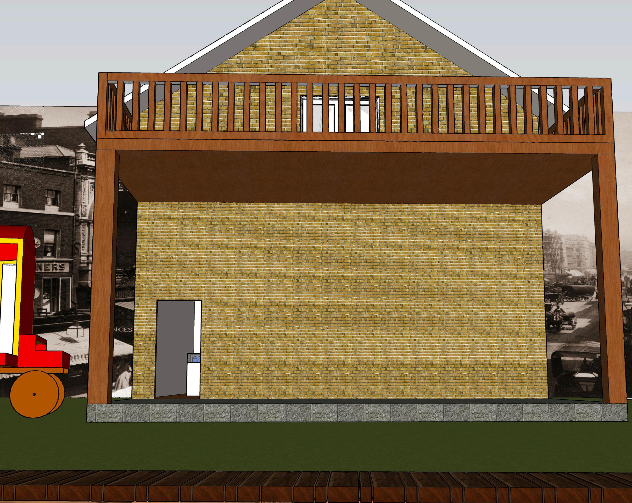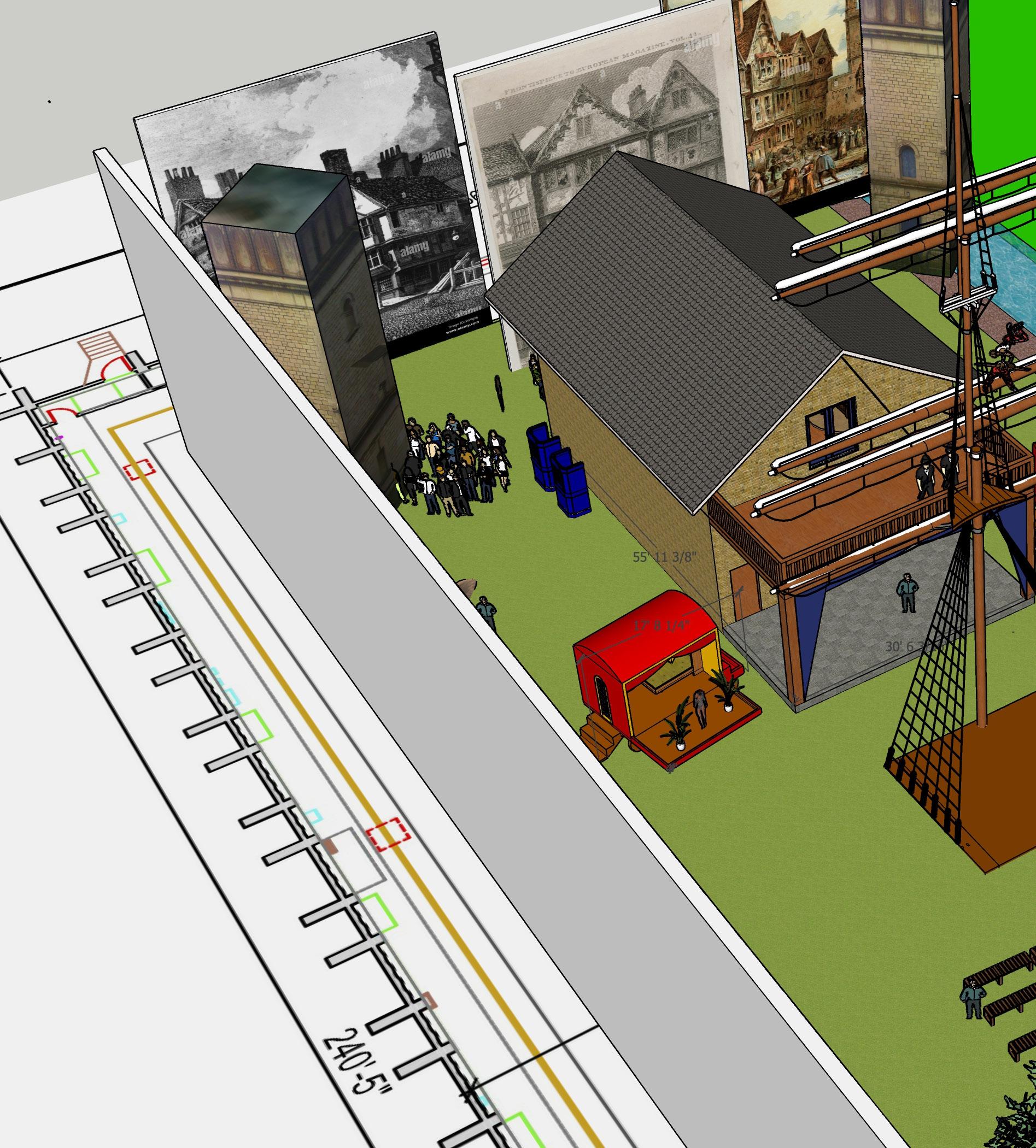 With this overview shot we can start to get a sense of the color scheme and the style of the surrounding area. The primary colors in the buildings on the painted flats we will see are beige's, browns, blacks, and whites. All neutral colors. This is also reflected in the museum itself. The wagons at this point have transformed from their boxy shape into more of Gypsy style wagon. This was more fitting for the type of person that would inhabit it and would allow for brighter colors to be used in contrast with the beige and brown of the landscape.