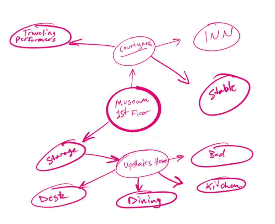 While thinking of the relation of the various places that interact with the set it can be very helpful to draw and diagram how the spaces of your set interact with each other. In that way you can create a map of sorts. Even if you don't end up using those spaces in your film it can be helpful to know what's beyond those windows and doors. This is taking us back to week 2 where we talked about metaphor, and suspending disbelief. We need to know what these spaces are so that our characters stay believable to our audience.