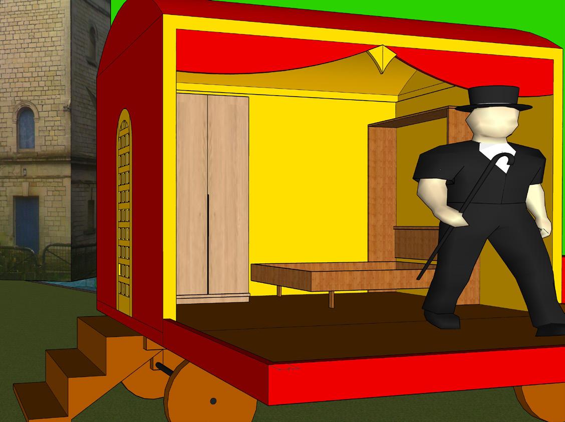 Behind the museum you will find the stage. This is the most key area of the set as this is where the actors spend their time entertaining the audience. One of the key areas of the set is a full sized ship mast that is use for death defying stunts. Acrobats climb high, swing on ropes, and walk a tightrope connected to the peak of the roof of the museum. In the picture to the left you can see how the seating is arrayed in front of the ship mast and how the stage is an addition to the museum building. There are a few elements like the blue curtains that help identify it as a stage. You can also see how the wagons might be arrayed to the side of the museum. Ideally if the set can be built large enough it would be valuable to have 2 on each side for a total of 4 wagons.