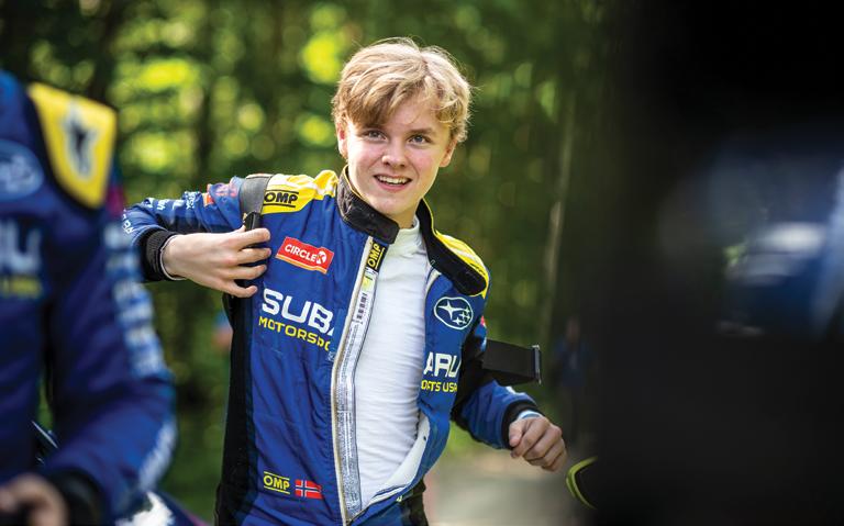 The mostly stock Subaru sedan is gaining more and more momentum as he declares a “flat” here, a “no cut” there, then “six minus tightens five plus”. He clicks an odometer button on the wiper stalk with increasing frequency, each time resetting a small digital readout velcroed to the dash. The co-driver furiously records the instructions in his own special shorthand notes to be read back later. Suddenly the road ahead is strewn with softball size stones and the unflinching pilot plows the Subie “Recce” car into an unfortunately placed rock knocking out the power steering with a sickening bang, my seatbelt tightens yet again. He calmly mentions the loss of steering function and slows to a reasonable pace while remarking what shit the road is, like a driver with decades of driving experience yet this comes from a teenager only recently granted a legal driver’s license for the road. Equal parts brash and aloof, Oliver Solberg is the Swedish seventeenyear-old offspring of 2003 World Rally Champion Petter Solberg and he has invited me to ride along (in the back seat) for a reconnaissance run.